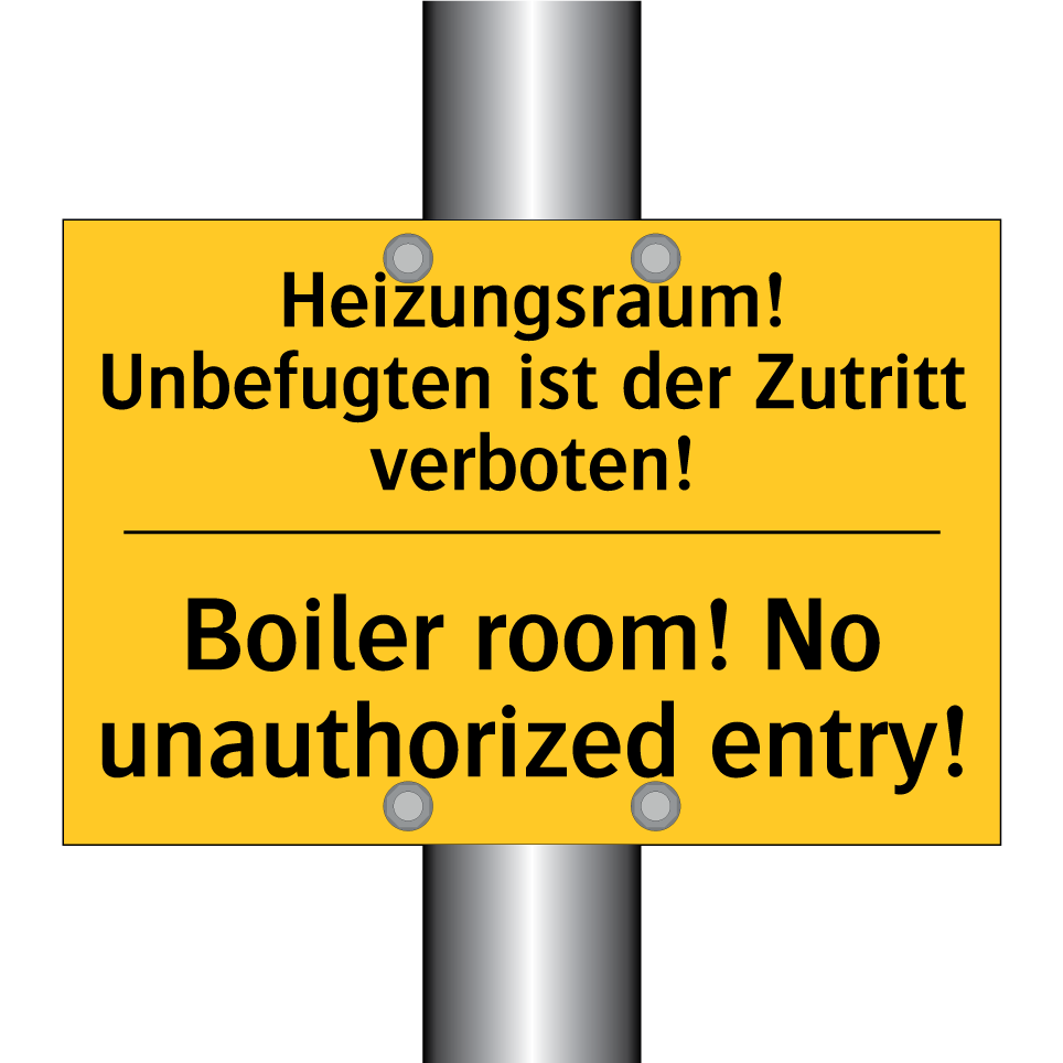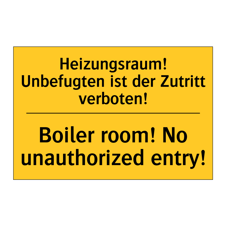 Zweisprachiges Warnschild mit deutschem Text Heizungsraum! Unbefugten ist der Zutritt verboten! und englischem Text Boiler room! No unauthorized entry!