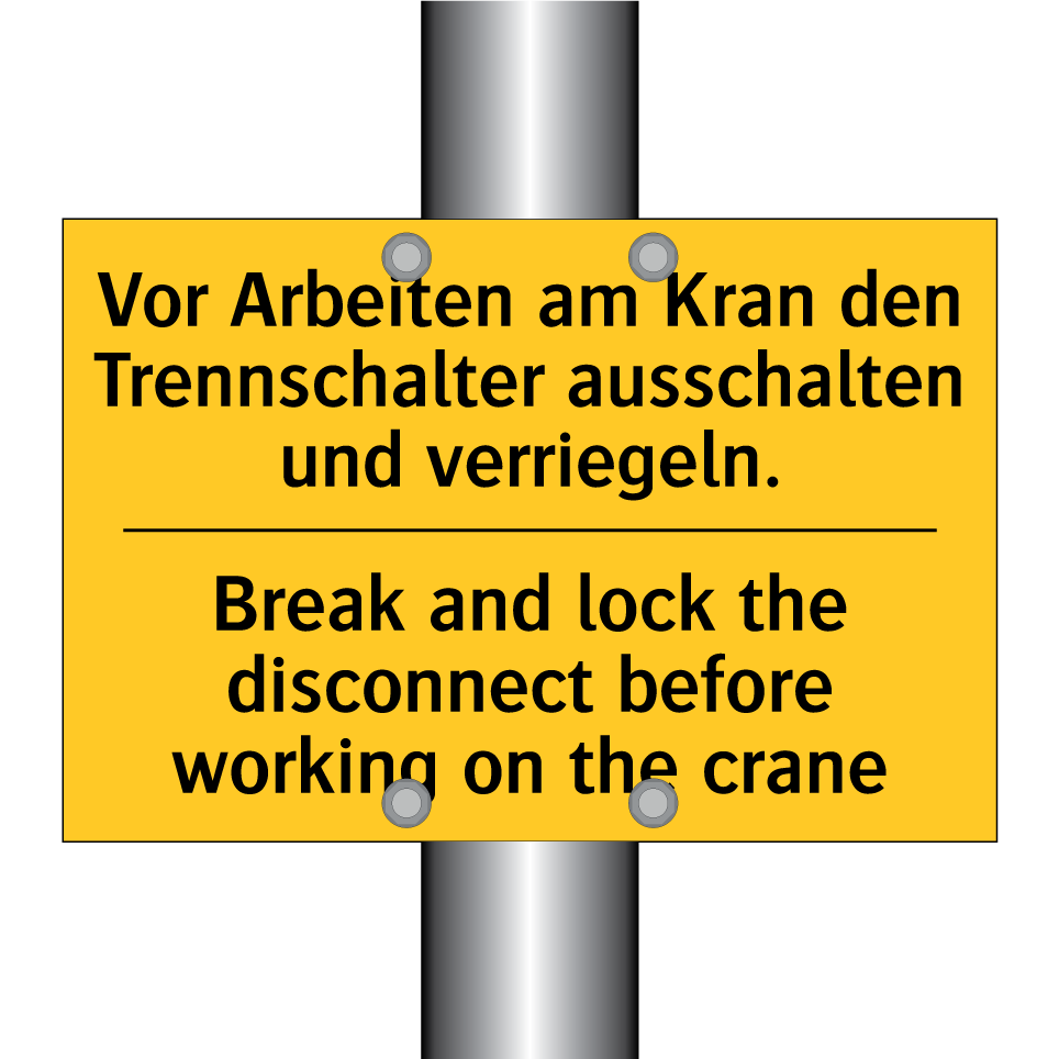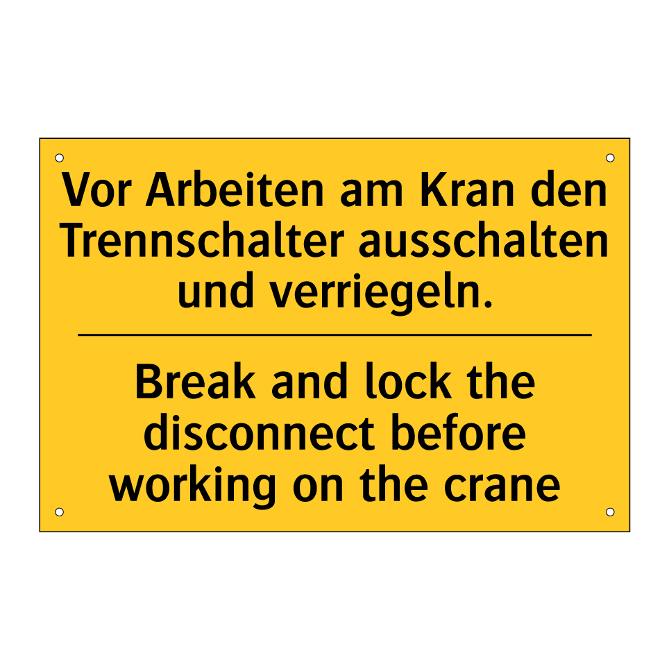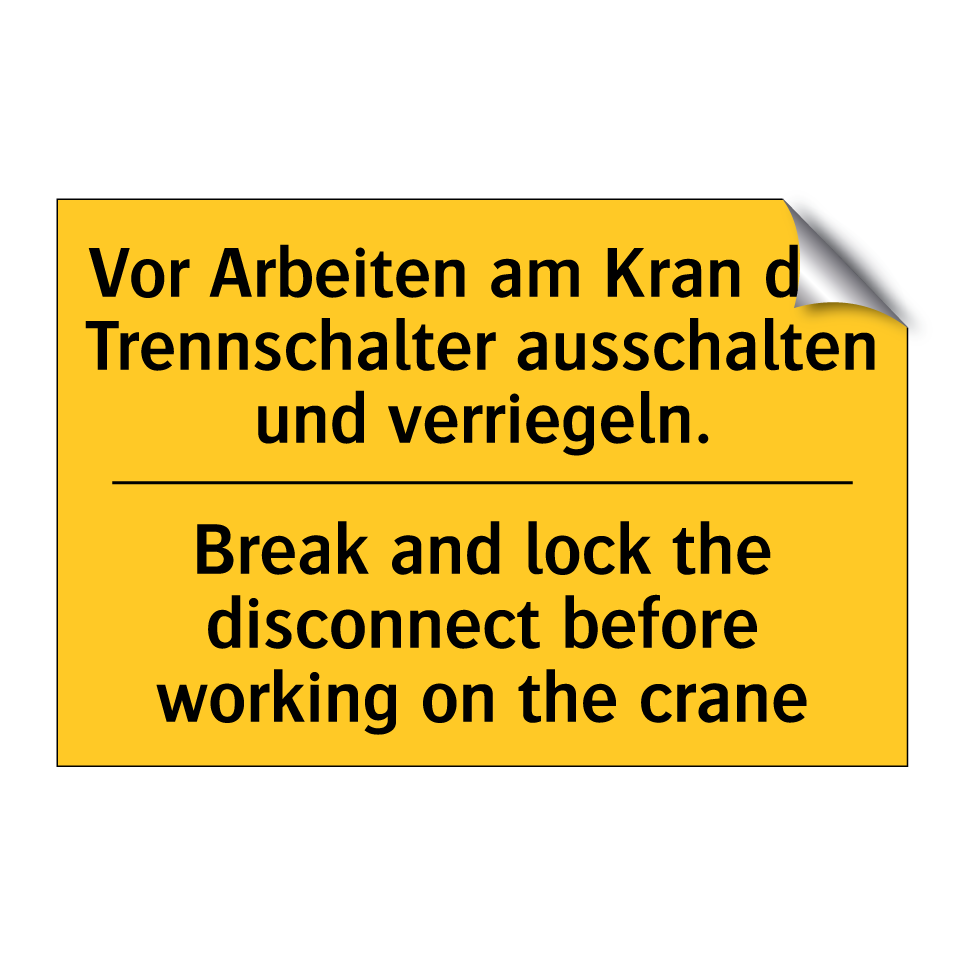 Zweisprachiges Warnschild mit deutschem Text Vor Arbeiten am Kran den Trennschalter ausschalten und verriegeln. und englischem Text Break and lock the disconnect before working on the crane