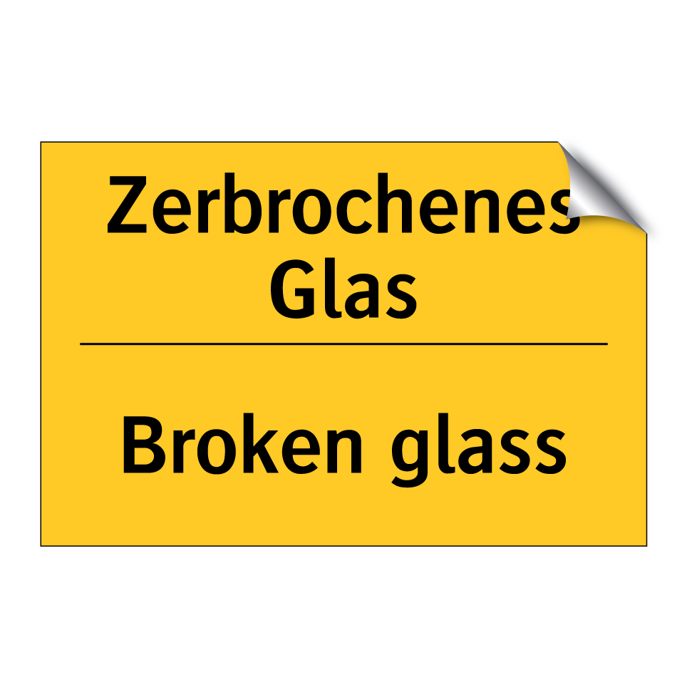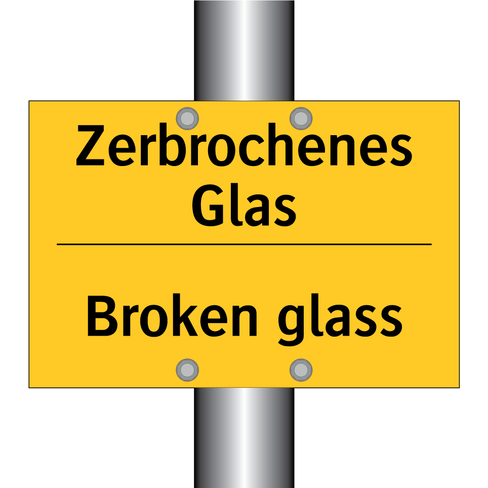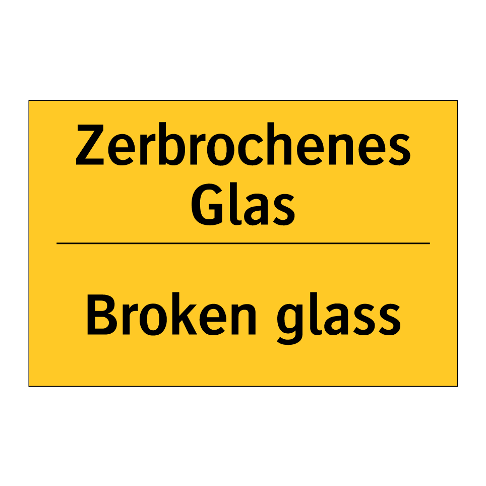 Zweisprachiges Warnschild mit deutschem Text Zerbrochenes Glas und englischem Text Broken glass