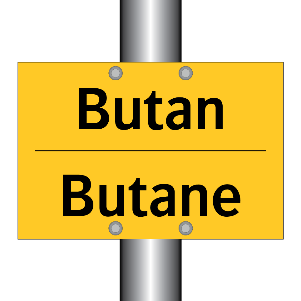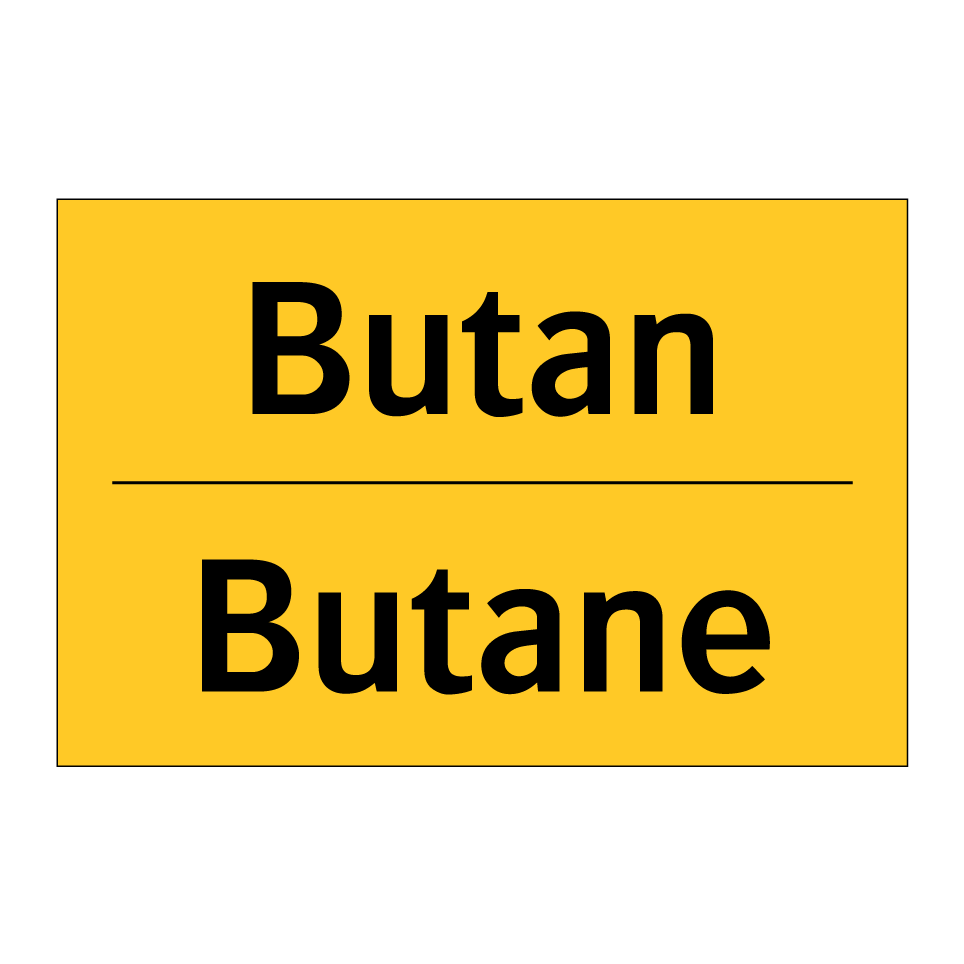 Zweisprachiges Warnschild mit deutschem Text Butan und englischem Text Butane