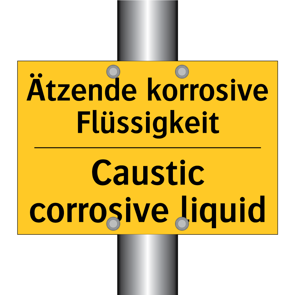 Zweisprachiges Warnschild mit deutschem Text Ätzende korrosive Flüssigkeit und englischem Text Caustic corrosive liquid