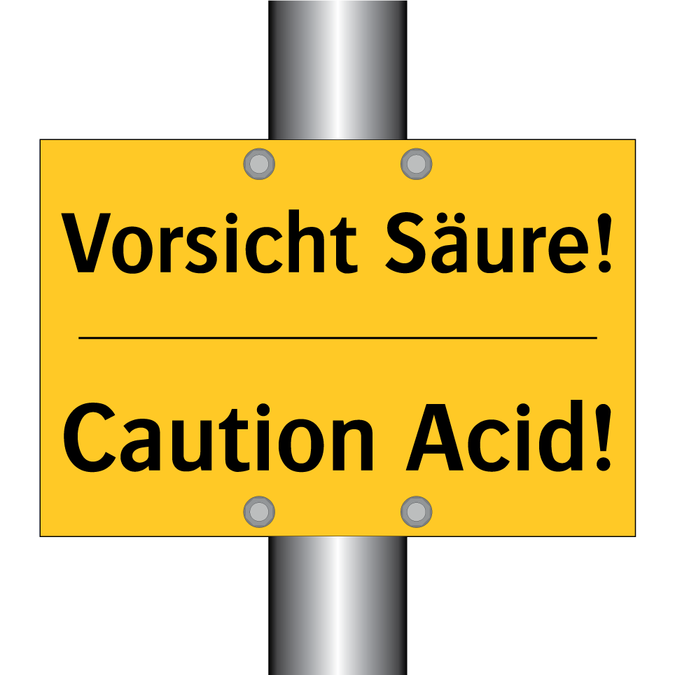 Zweisprachiges Warnschild mit deutschem Text Vorsicht Säure! und englischem Text Caution Acid!