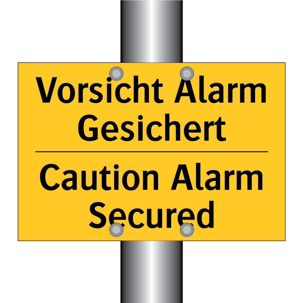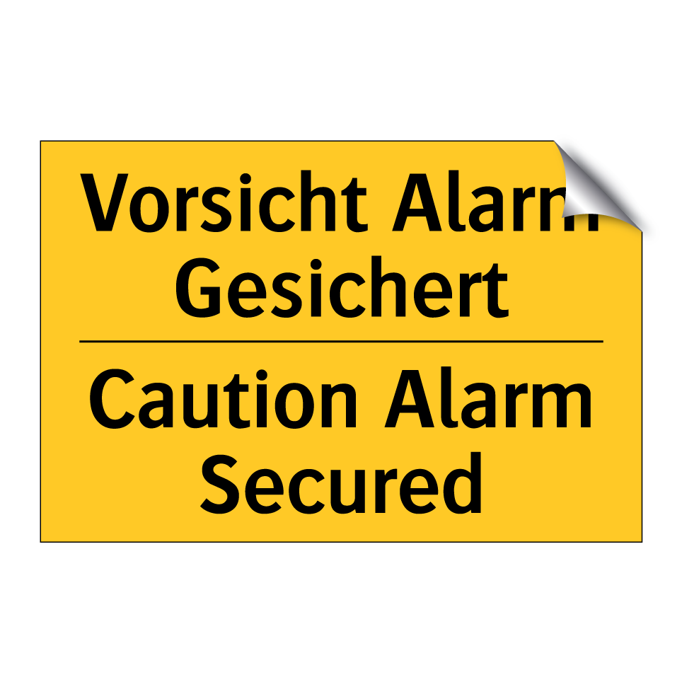 Zweisprachiges Warnschild mit deutschem Text Vorsicht Alarm Gesichert und englischem Text Caution Alarm Secured