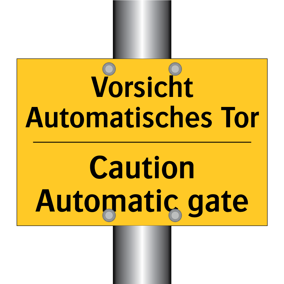 Zweisprachiges Warnschild mit deutschem Text Vorsicht Automatisches Tor und englischem Text Caution Automatic gate