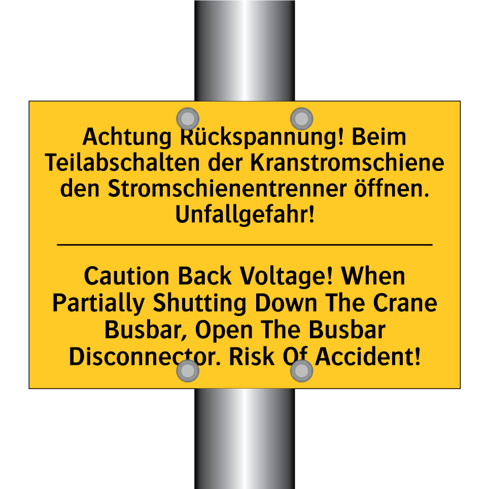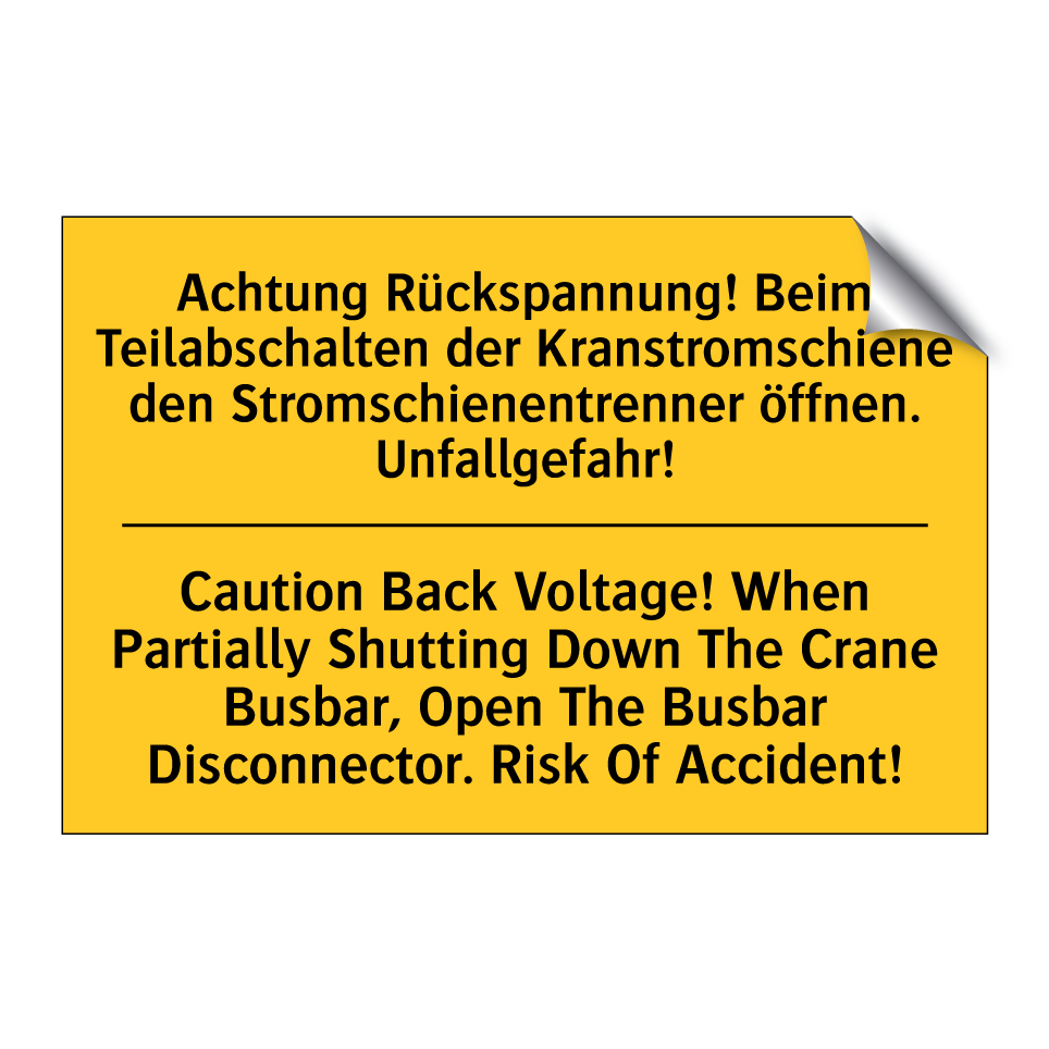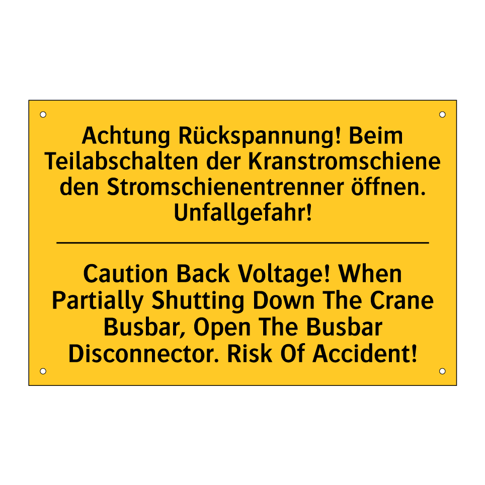Zweisprachiges Warnschild mit deutschem Text Achtung Rückspannung! Beim Teilabschalten der Kranstromschiene den Stromschienentrenner öffnen. Unfallgefahr! und englischem Text Caution Back Voltage! When Partially Shutting Down The Crane Busbar, Open The Busbar Disconnector. Risk Of Accident!