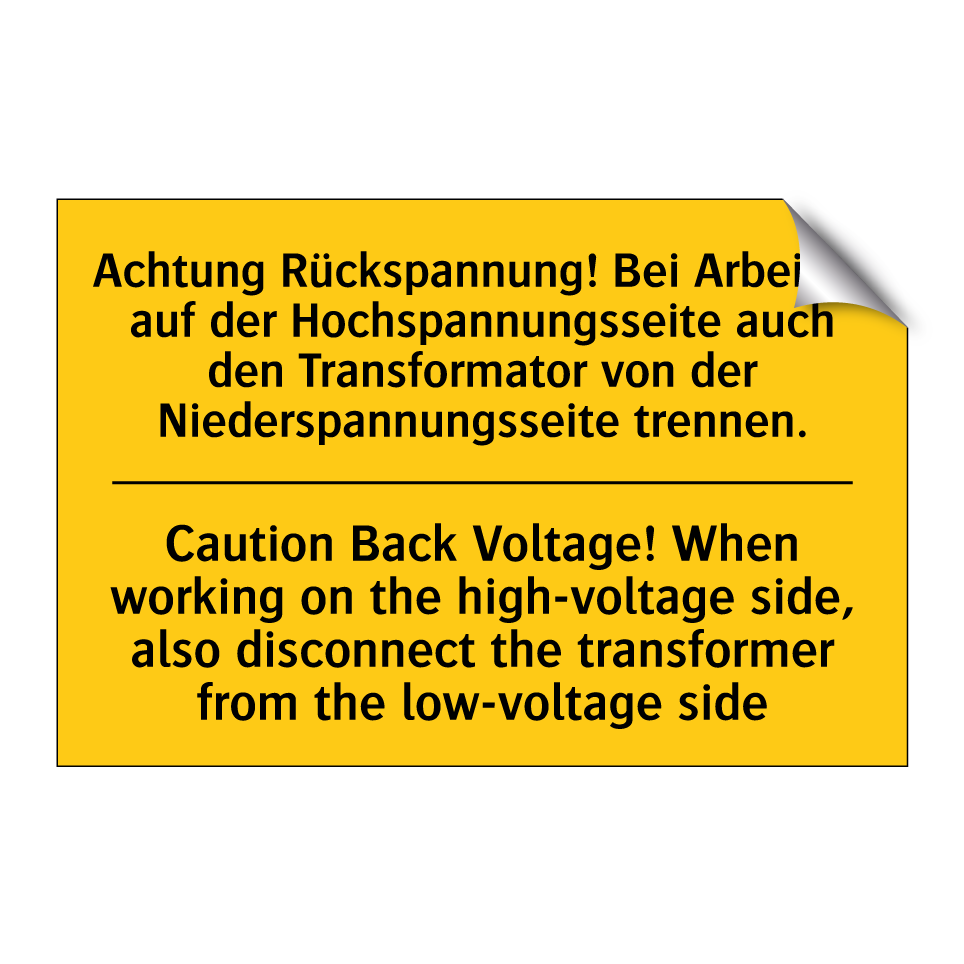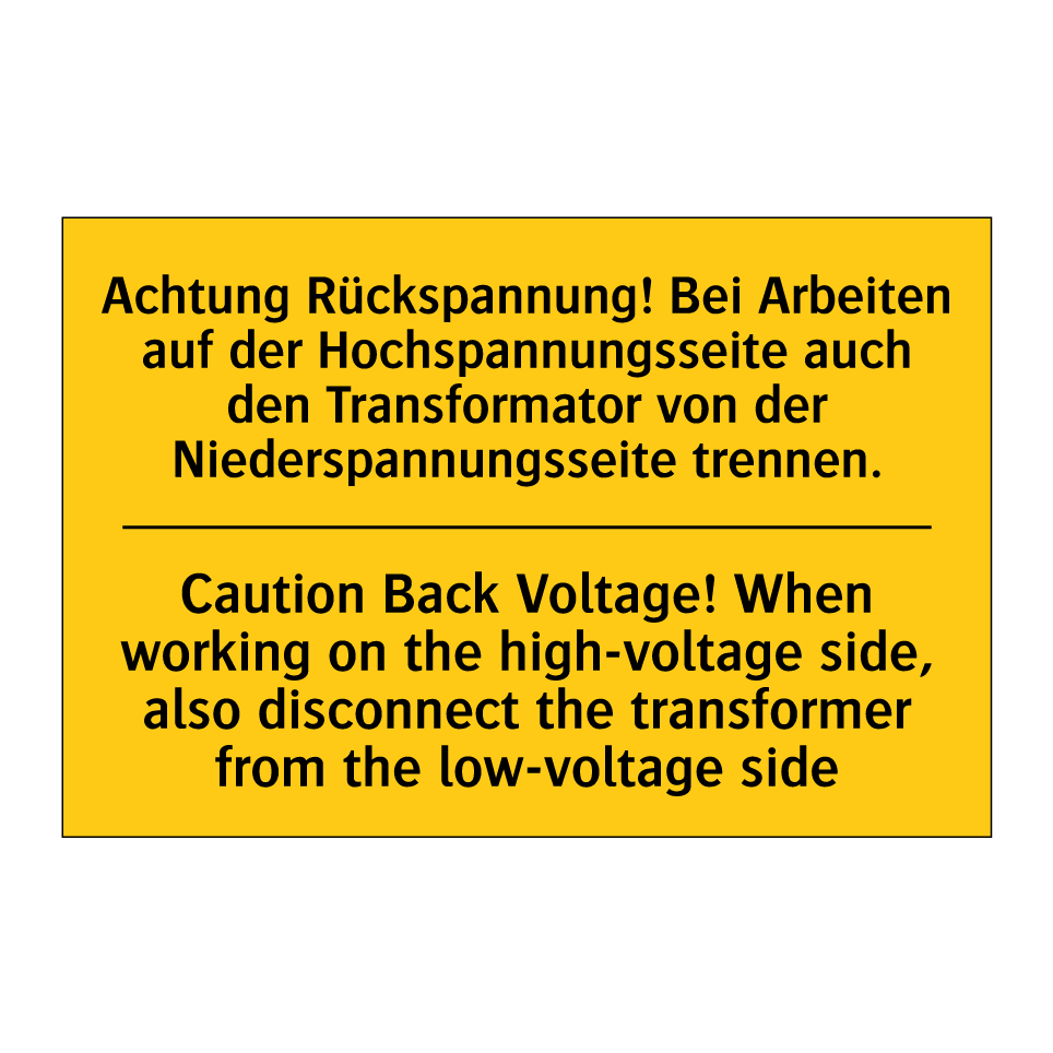 Zweisprachiges Warnschild mit deutschem Text Achtung Rückspannung! Bei Arbeiten auf der Hochspannungsseite auch den Transformator von der Niederspannungsseite trennen. und englischem Text Caution Back Voltage! When working on the high-voltage side, also disconnect the transformer from the low-voltage side
