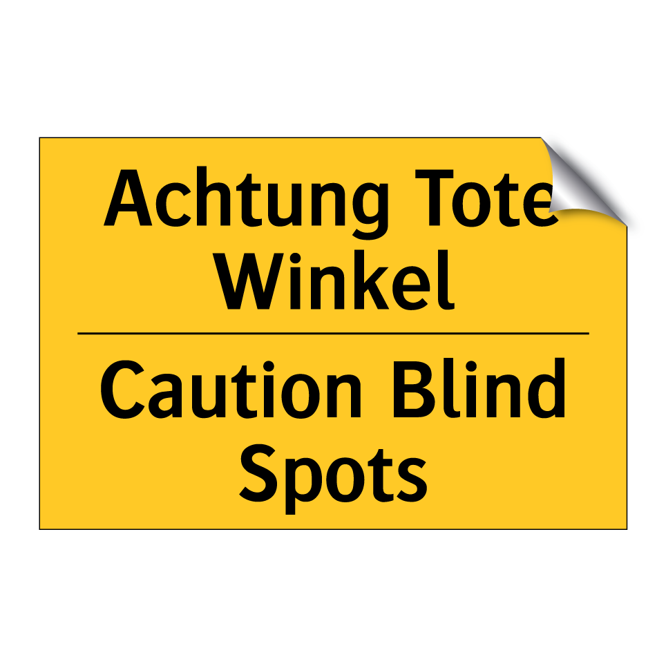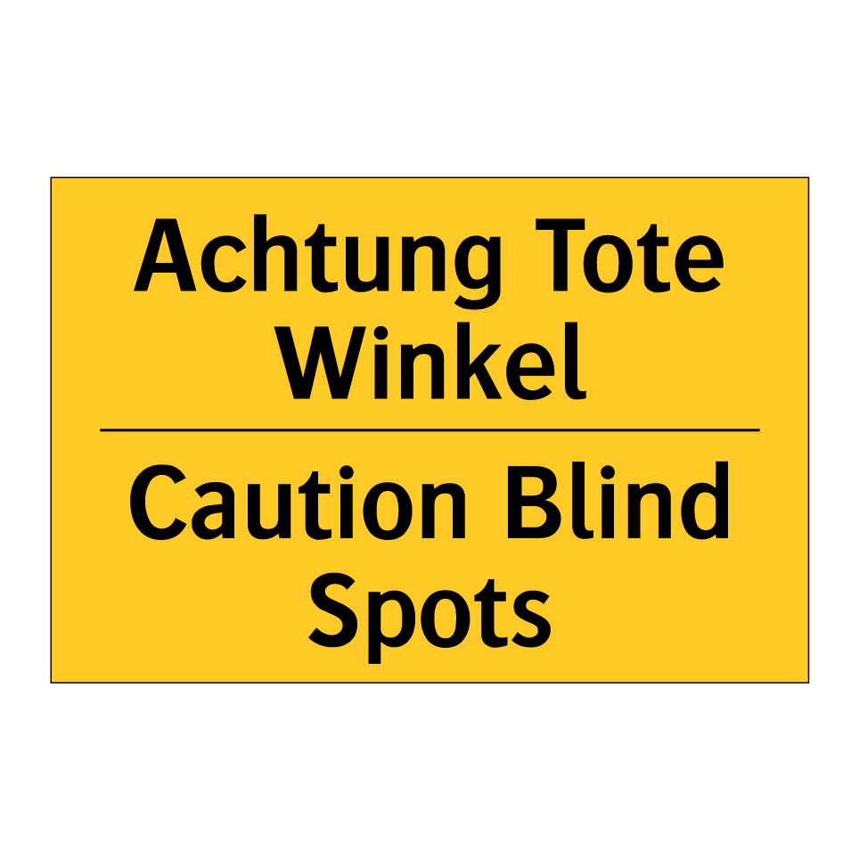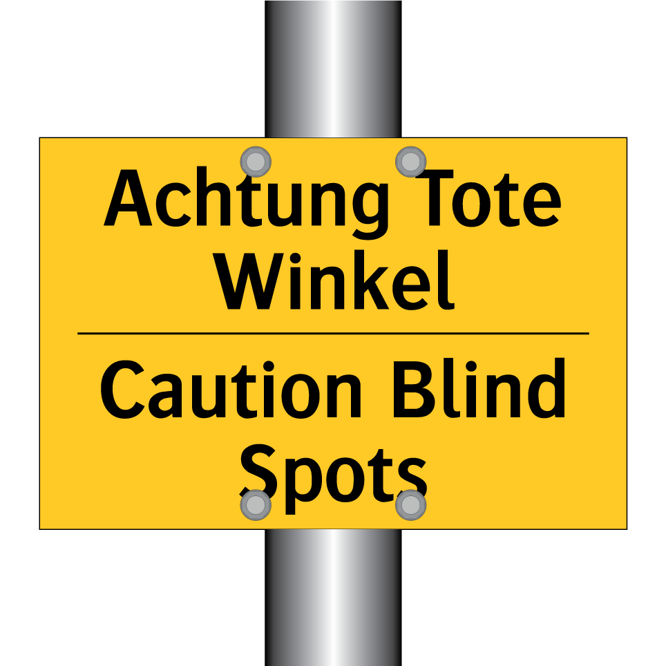 Zweisprachiges Warnschild mit deutschem Text Achtung Tote Winkel und englischem Text Caution Blind Spots