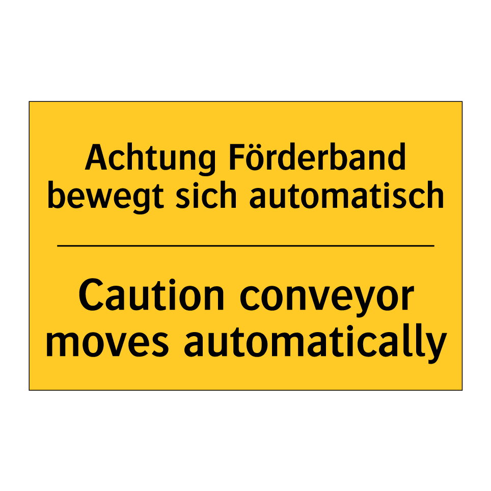 Zweisprachiges Warnschild mit deutschem Text Achtung Förderband bewegt sich automatisch und englischem Text Caution conveyor moves automatically