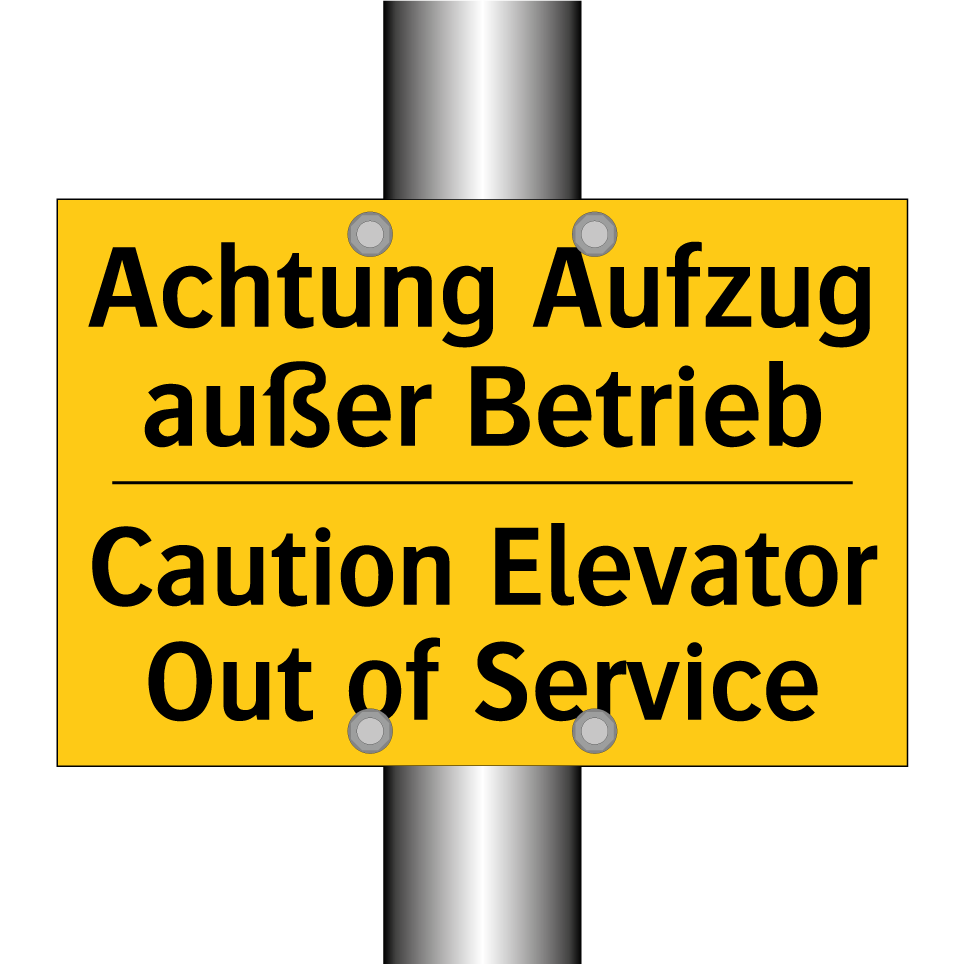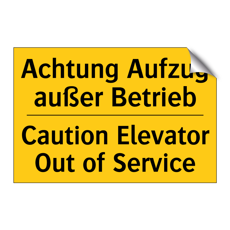 Zweisprachiges Warnschild mit deutschem Text Achtung Aufzug außer Betrieb und englischem Text Caution Elevator Out of Service