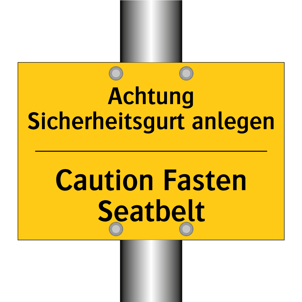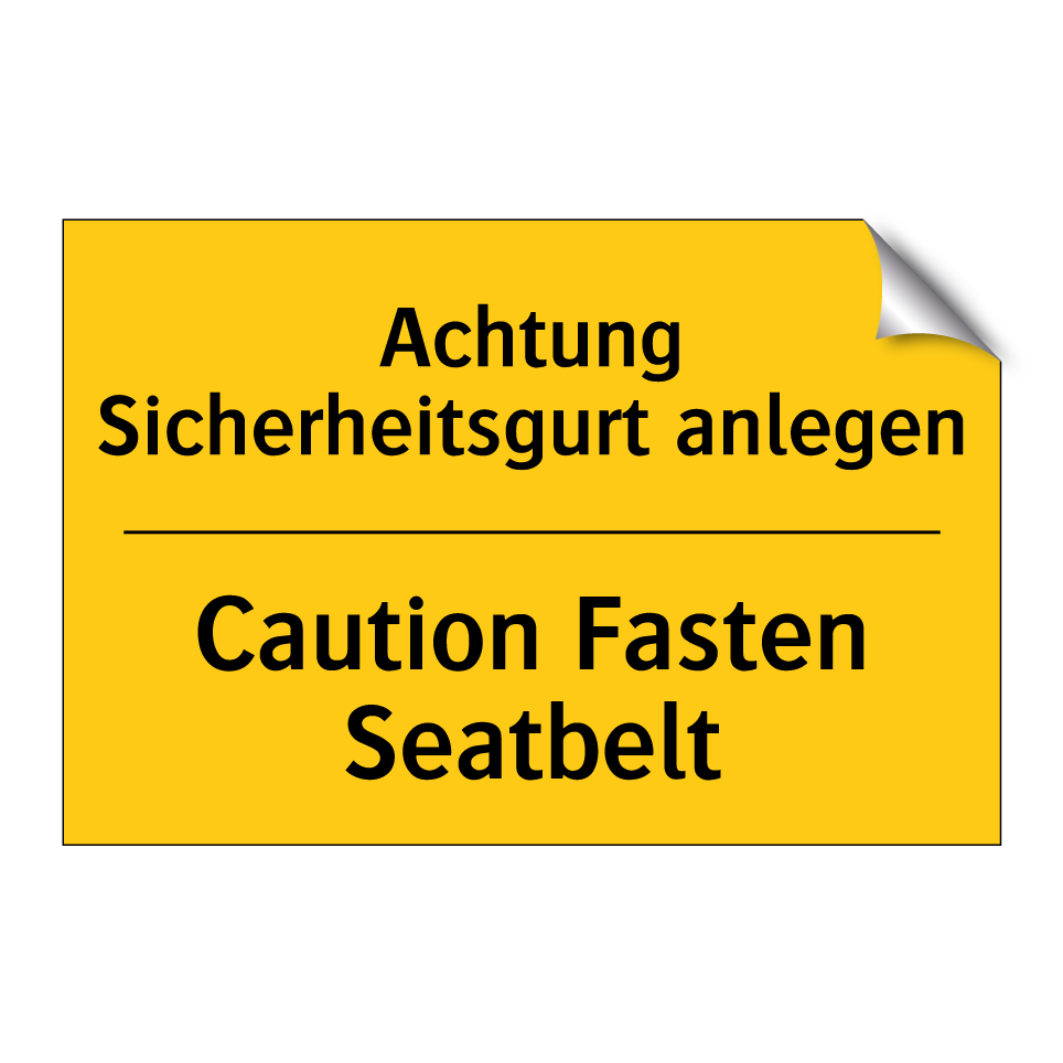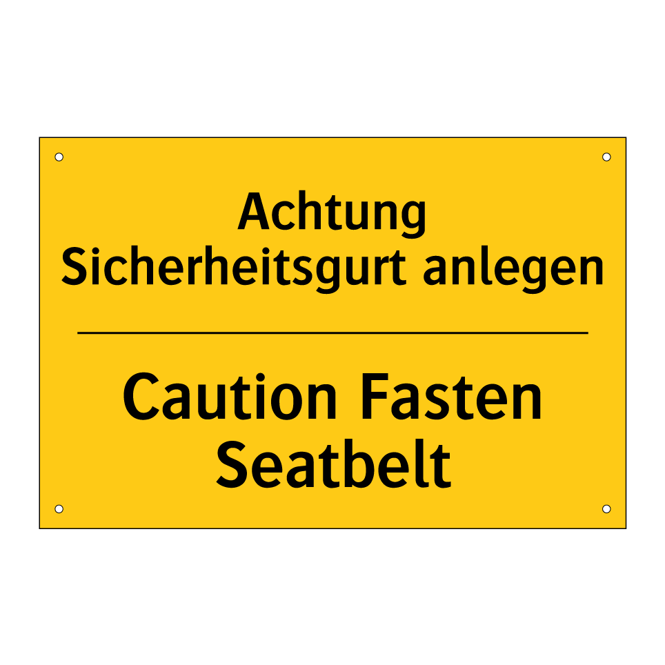 Zweisprachiges Warnschild mit deutschem Text Achtung Sicherheitsgurt anlegen und englischem Text Caution Fasten Seatbelt