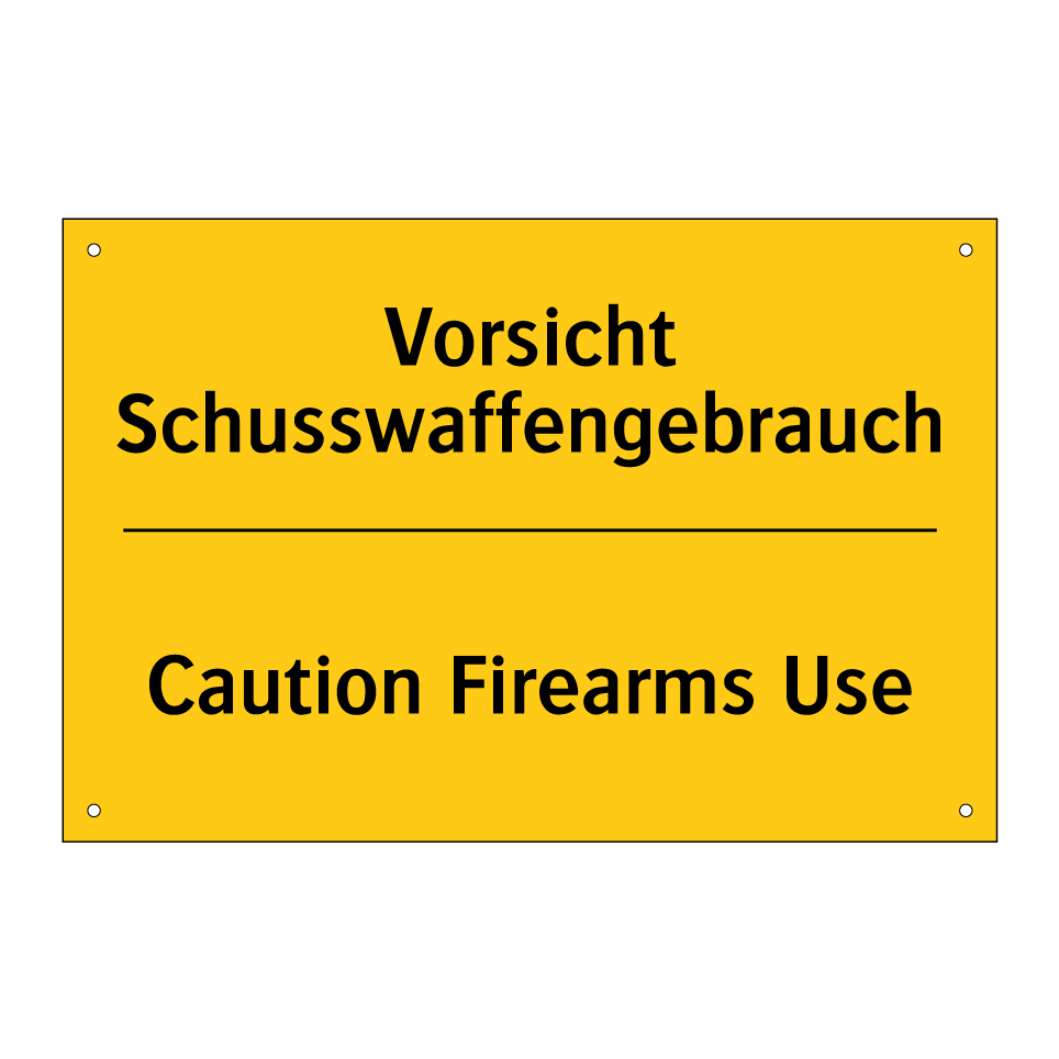 Zweisprachiges Warnschild mit deutschem Text Vorsicht Schusswaffengebrauch und englischem Text Caution Firearms Use
