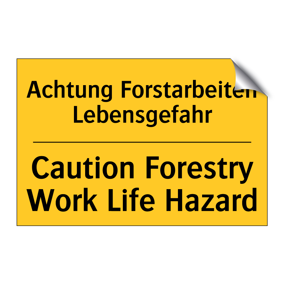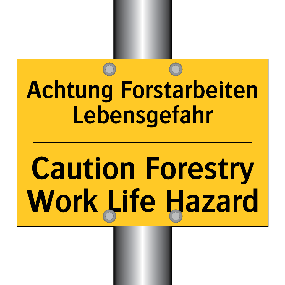 Zweisprachiges Warnschild mit deutschem Text Achtung Forstarbeiten Lebensgefahr und englischem Text Caution Forestry Work Life Hazard