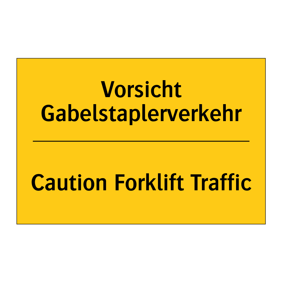 Zweisprachiges Warnschild mit deutschem Text Vorsicht Gabelstaplerverkehr und englischem Text Caution Forklift Traffic