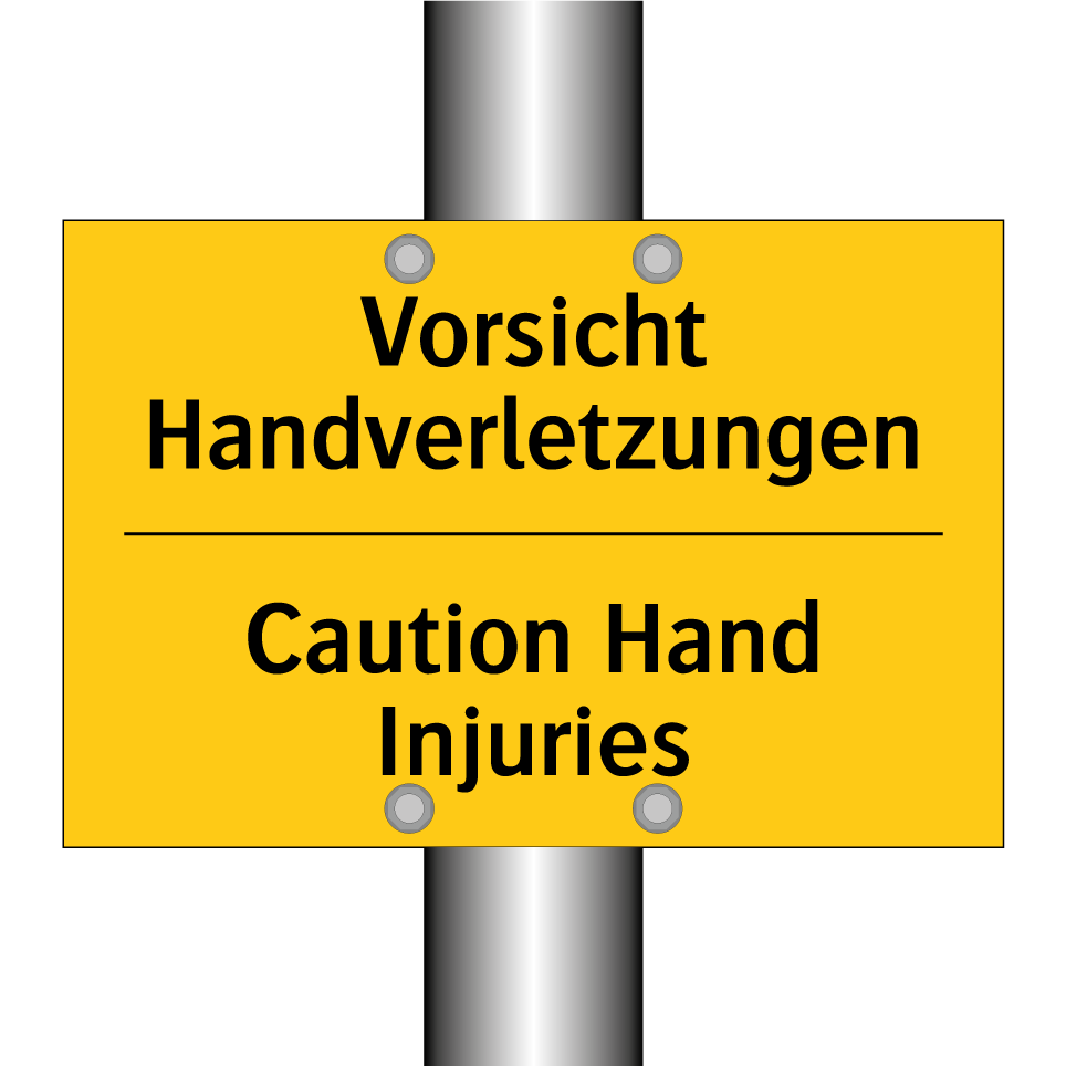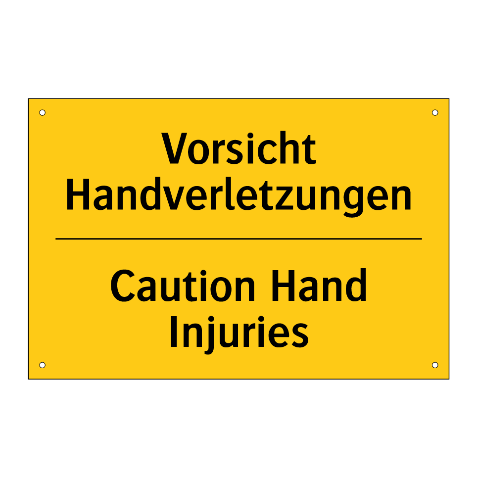 Zweisprachiges Warnschild mit deutschem Text Vorsicht Handverletzungen und englischem Text Caution Hand Injuries