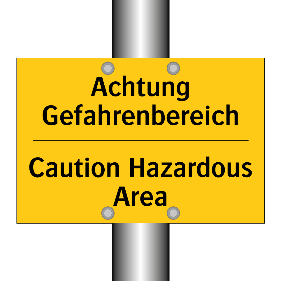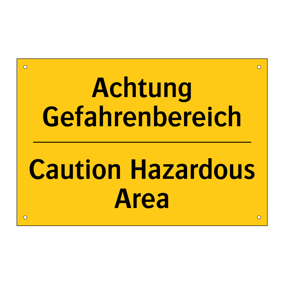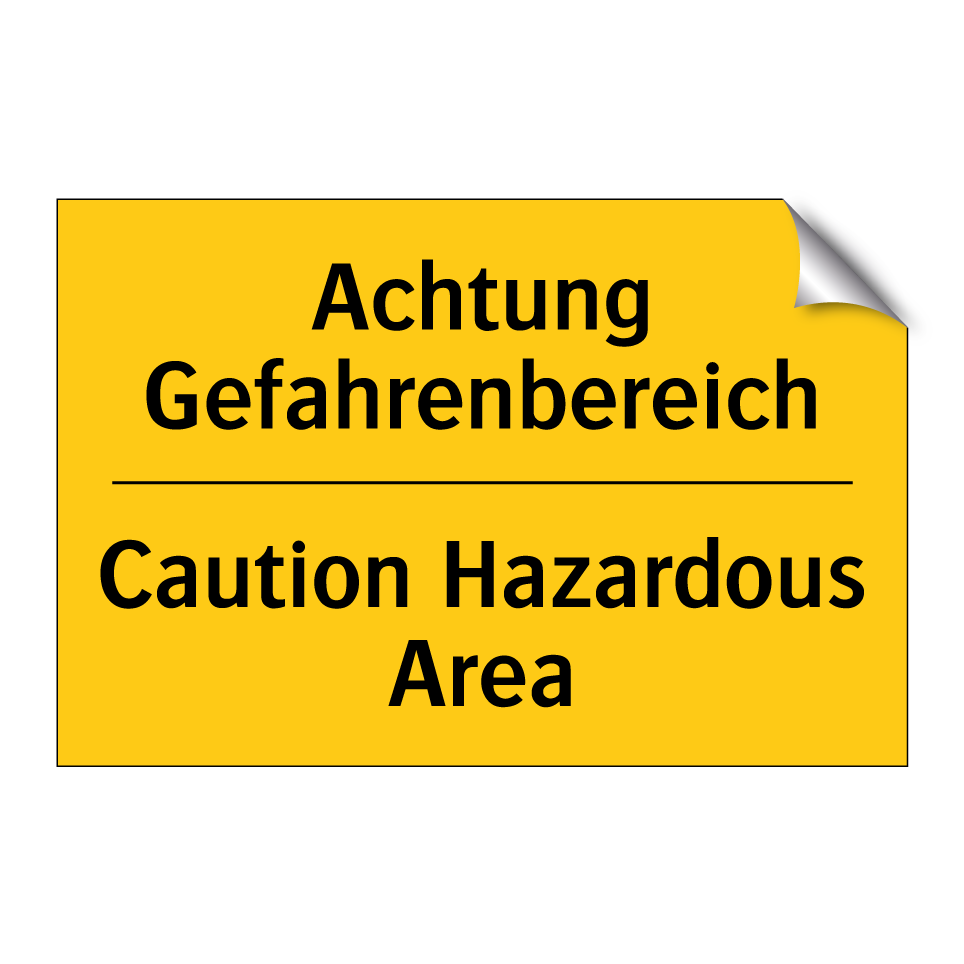 Zweisprachiges Warnschild mit deutschem Text Achtung Gefahrenbereich und englischem Text Caution Hazardous Area