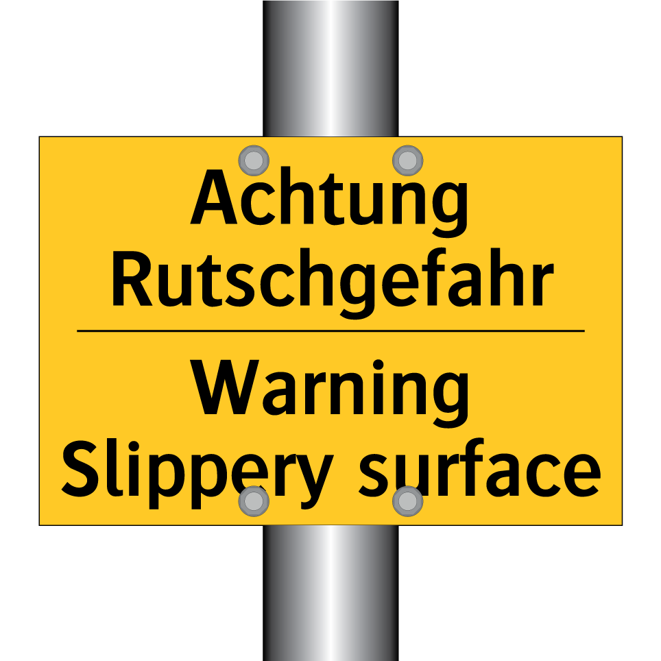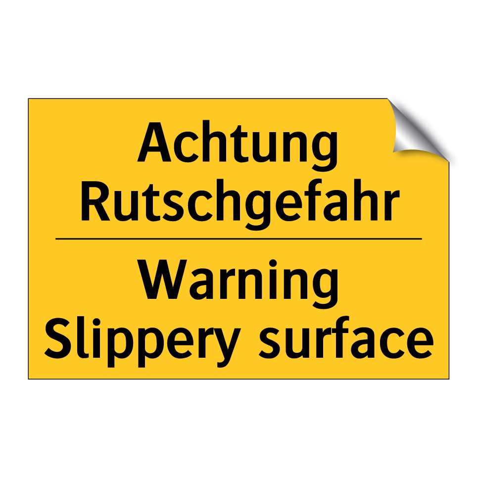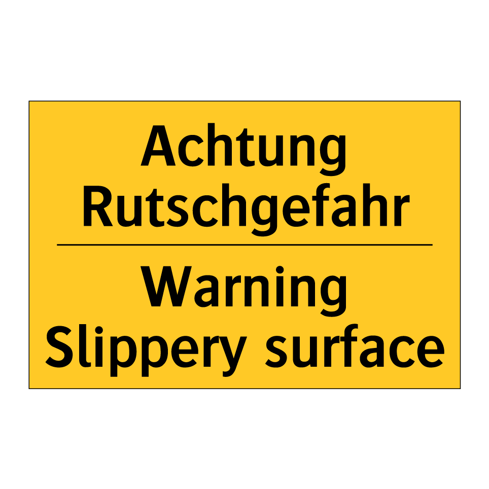 Zweisprachiges Warnschild mit deutschem Text Achtung Rutschgefahr und englischem Text Warning Slippery surface