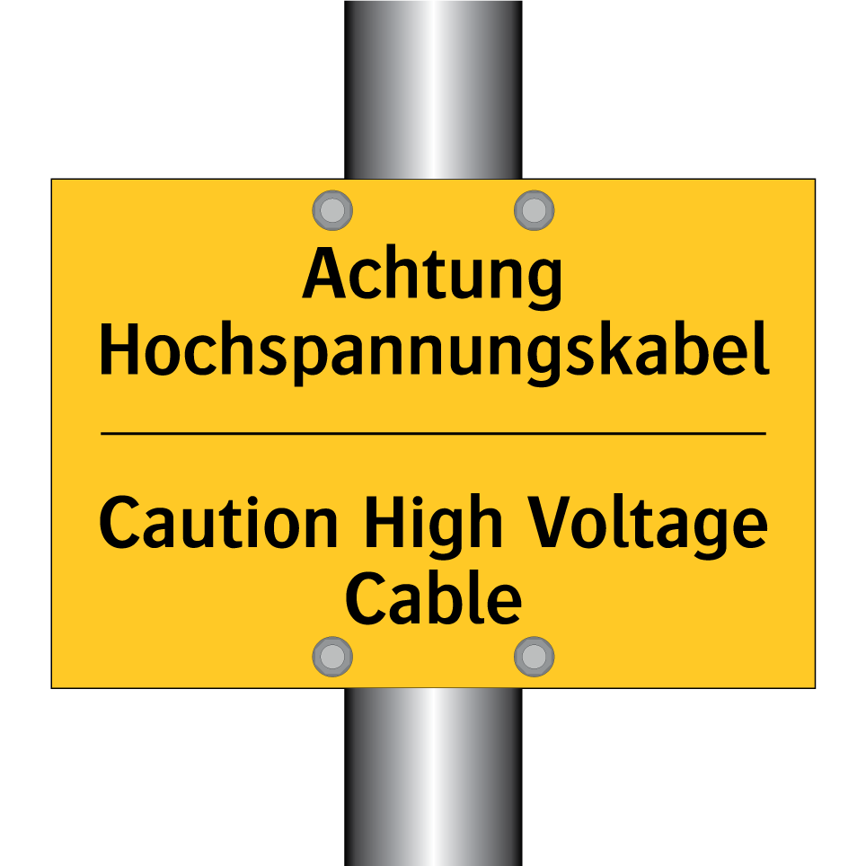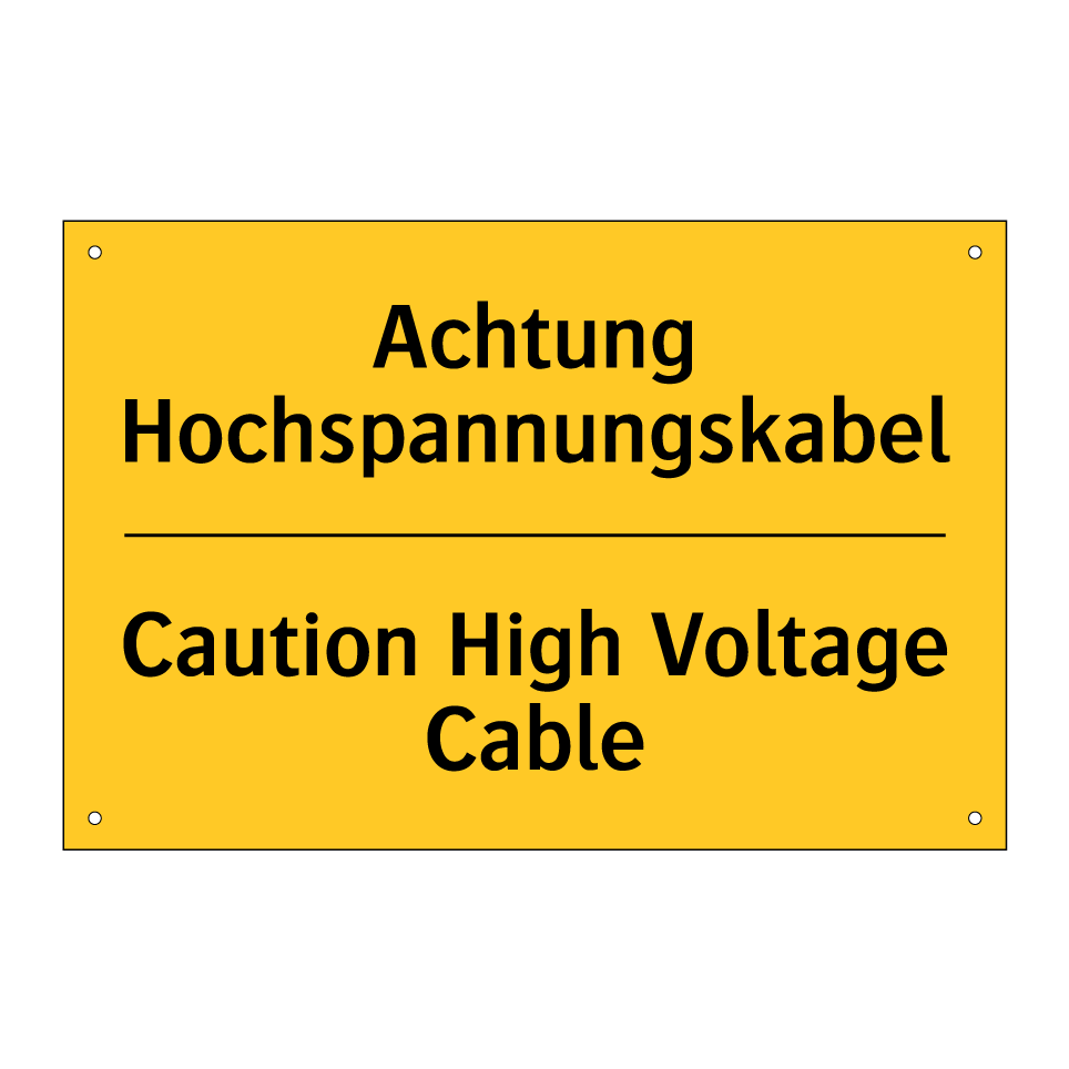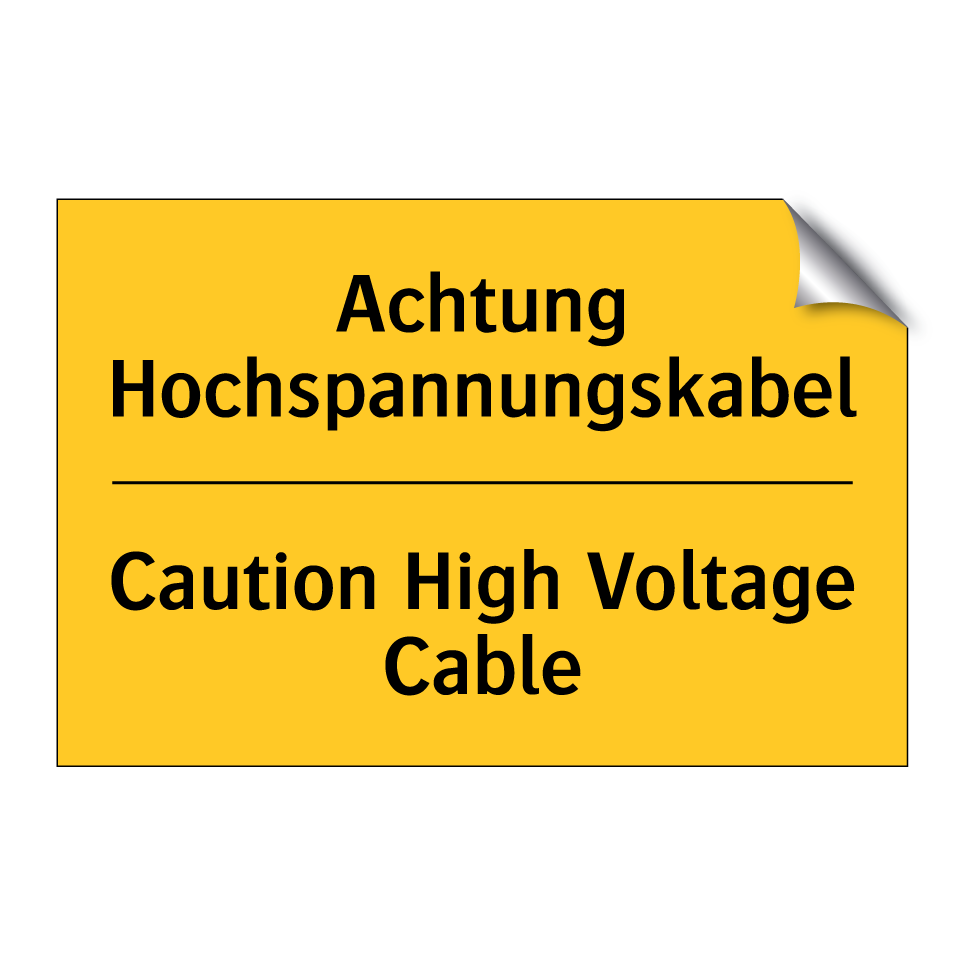 Zweisprachiges Warnschild mit deutschem Text Achtung Hochspannungskabel und englischem Text Caution High Voltage Cable