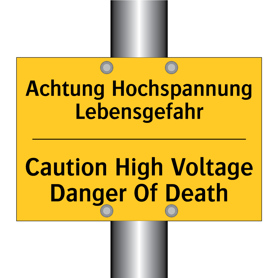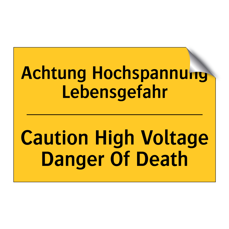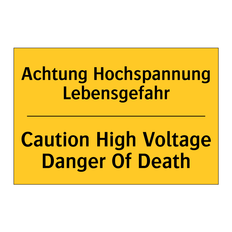 Zweisprachiges Warnschild mit deutschem Text Achtung Hochspannung Lebensgefahr und englischem Text Caution High Voltage Danger Of Death
