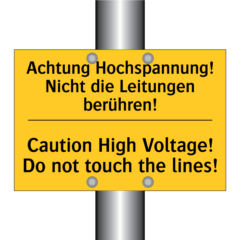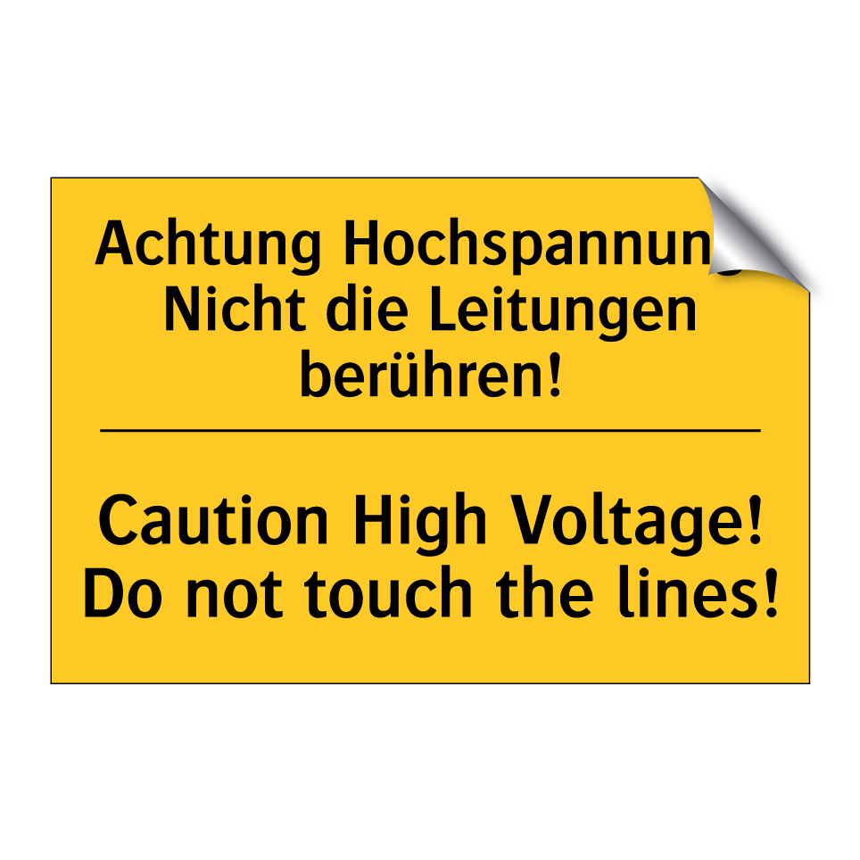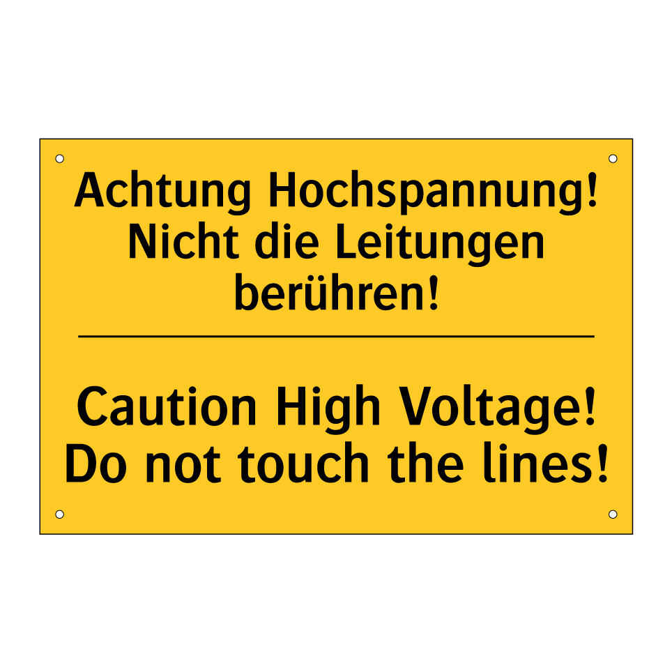Zweisprachiges Warnschild mit deutschem Text Achtung Hochspannung! Nicht die Leitungen berühren! und englischem Text Caution High Voltage! Do not touch the lines!
