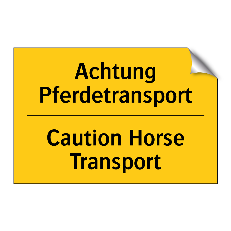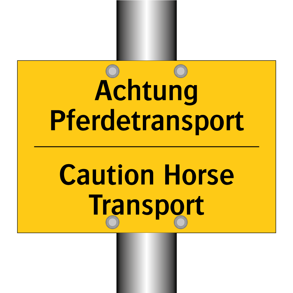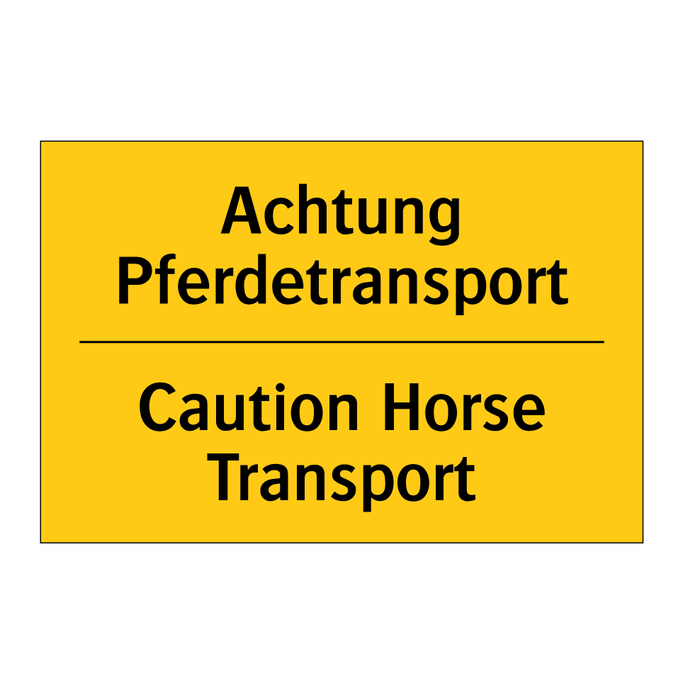 Zweisprachiges Warnschild mit deutschem Text Achtung Pferdetransport und englischem Text Caution Horse Transport