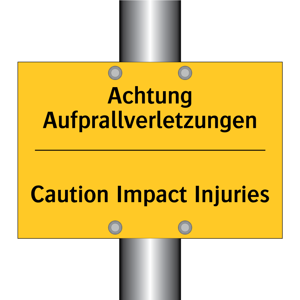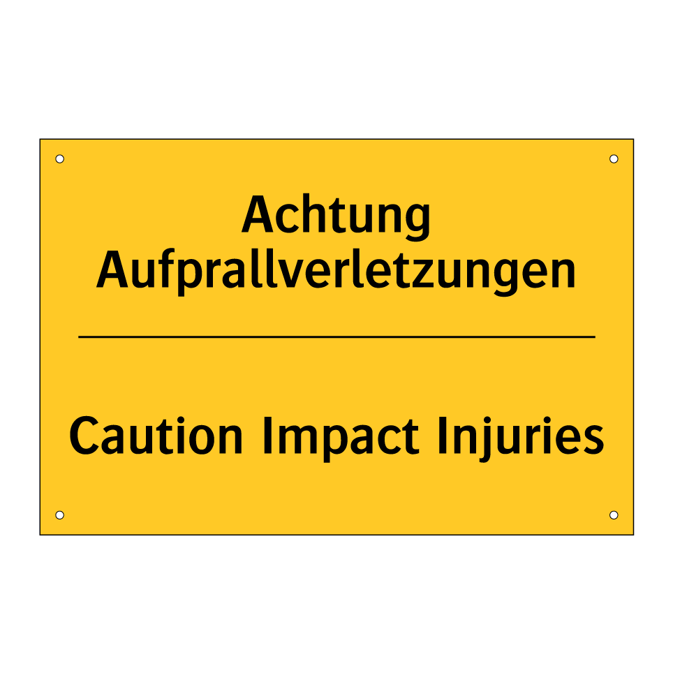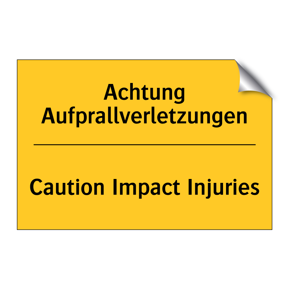 Zweisprachiges Warnschild mit deutschem Text Achtung Aufprallverletzungen und englischem Text Caution Impact Injuries