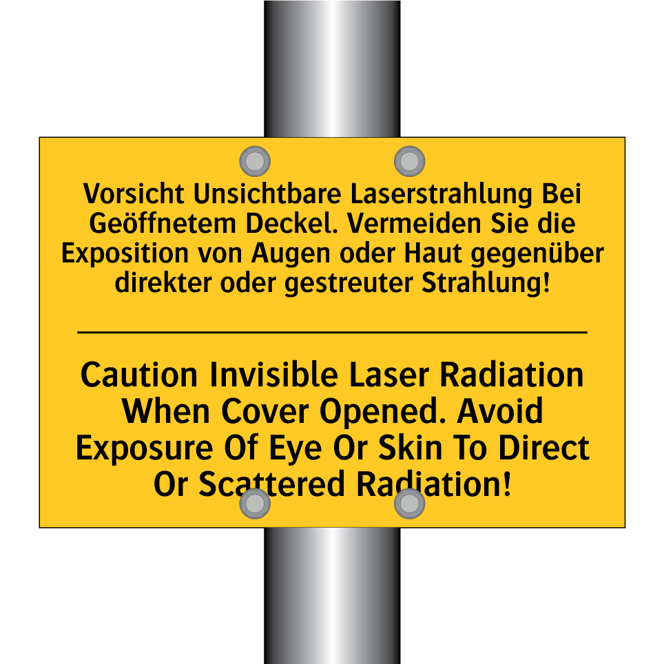 Zweisprachiges Warnschild mit deutschem Text Vorsicht Unsichtbare Laserstrahlung Bei Geöffnetem Deckel. Vermeiden Sie die Exposition von Augen oder Haut gegenüber direkter oder gestreuter Strahlung! und englischem Text Caution Invisible Laser Radiation When Cover Opened. Avoid Exposure Of Eye Or Skin To Direct Or Scattered Radiation!