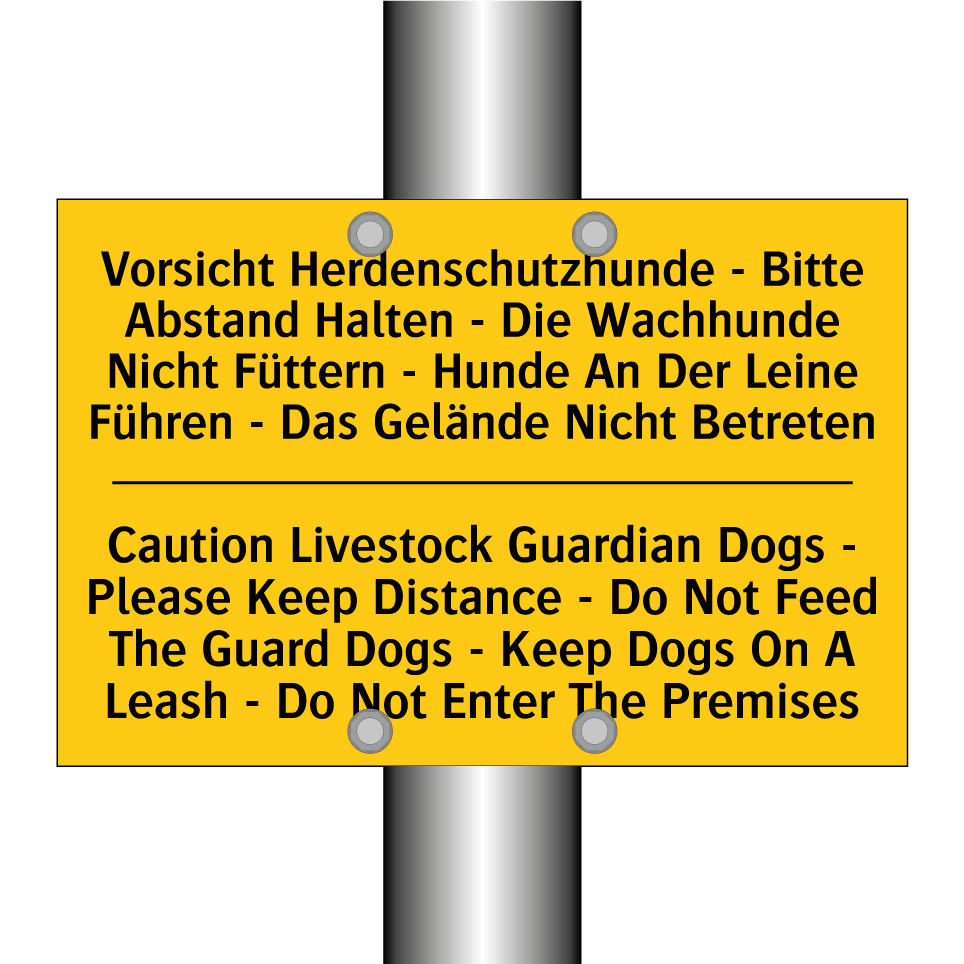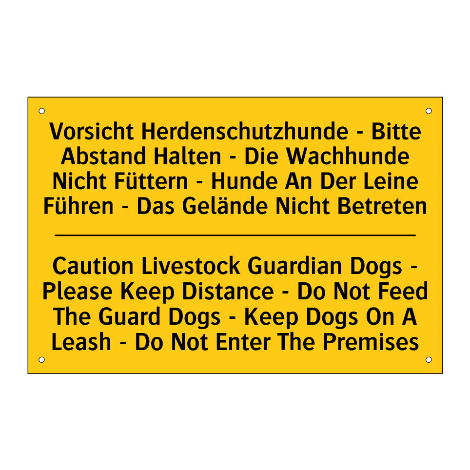 Zweisprachiges Warnschild mit deutschem Text Vorsicht Herdenschutzhunde - Bitte Abstand Halten - Die Wachhunde Nicht Füttern - Hunde An Der Leine Führen - Das Gelände Nicht Betreten und englischem Text Caution Livestock Guardian Dogs - Please Keep Distance - Do Not Feed The Guard Dogs - Keep Dogs On A Leash - Do Not Enter The Premises