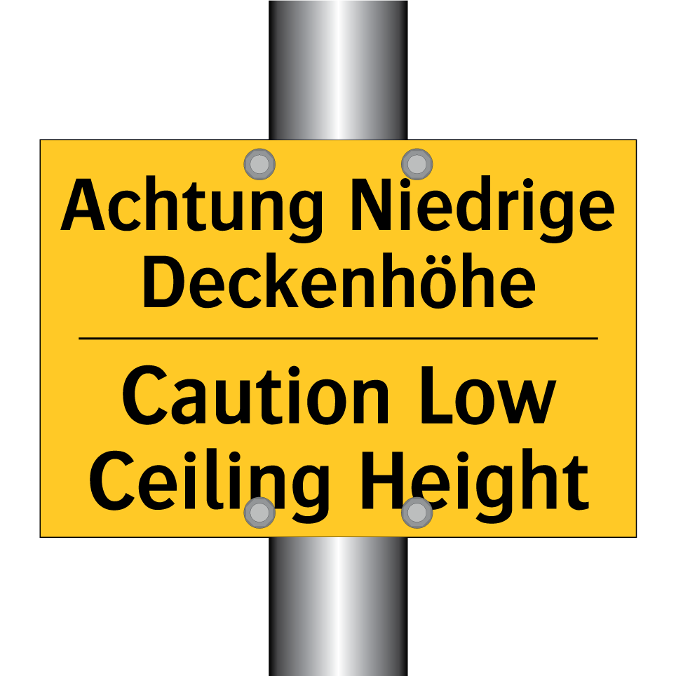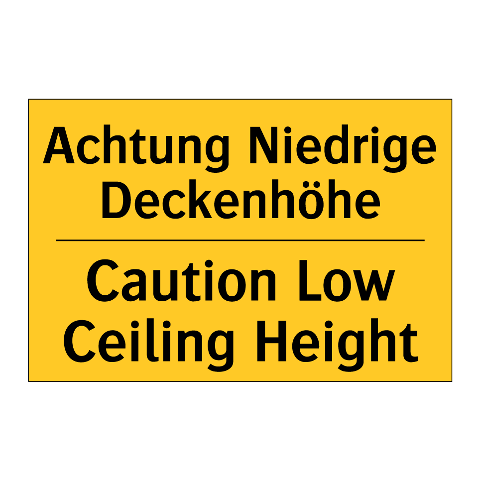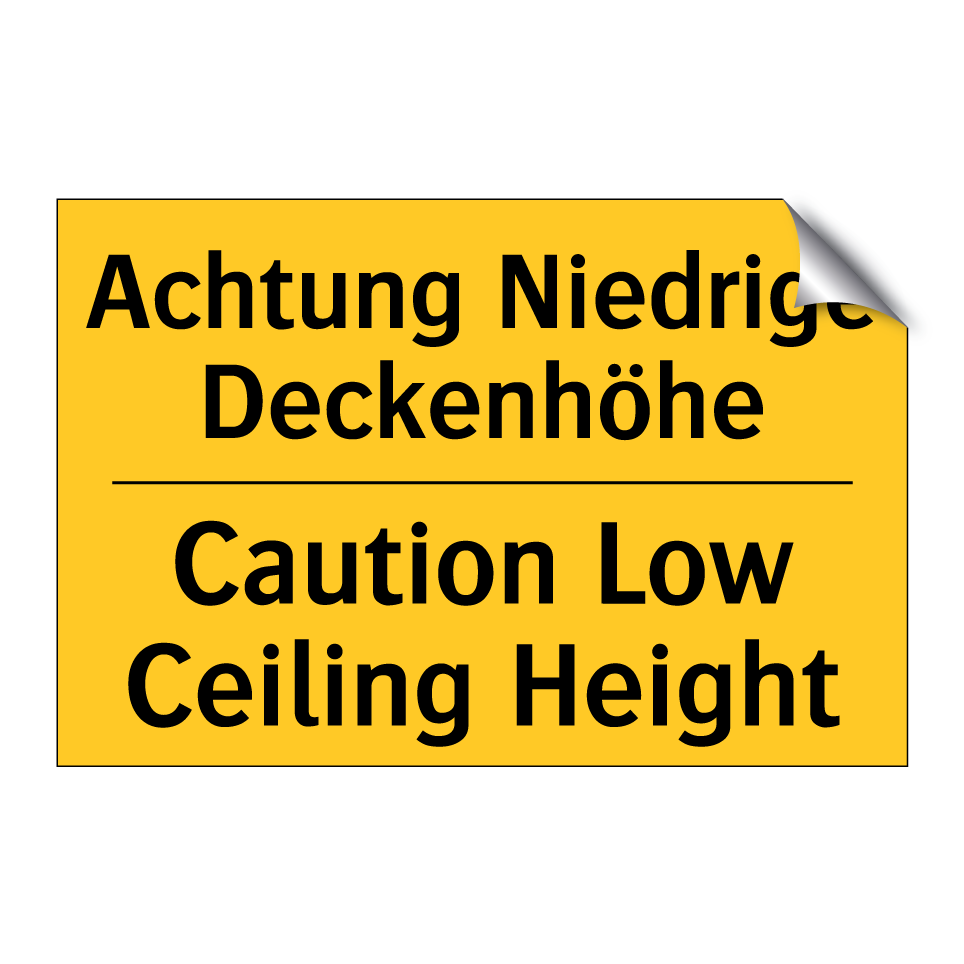 Zweisprachiges Warnschild mit deutschem Text Achtung Niedrige Deckenhöhe und englischem Text Caution Low Ceiling Height