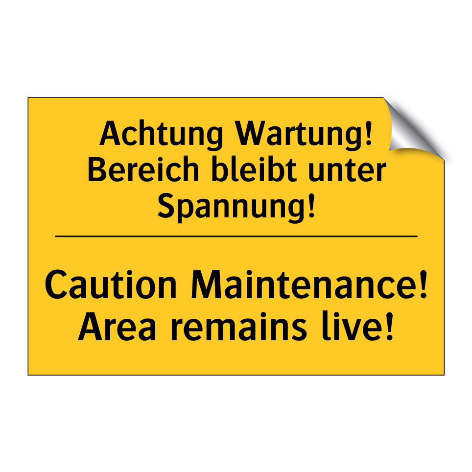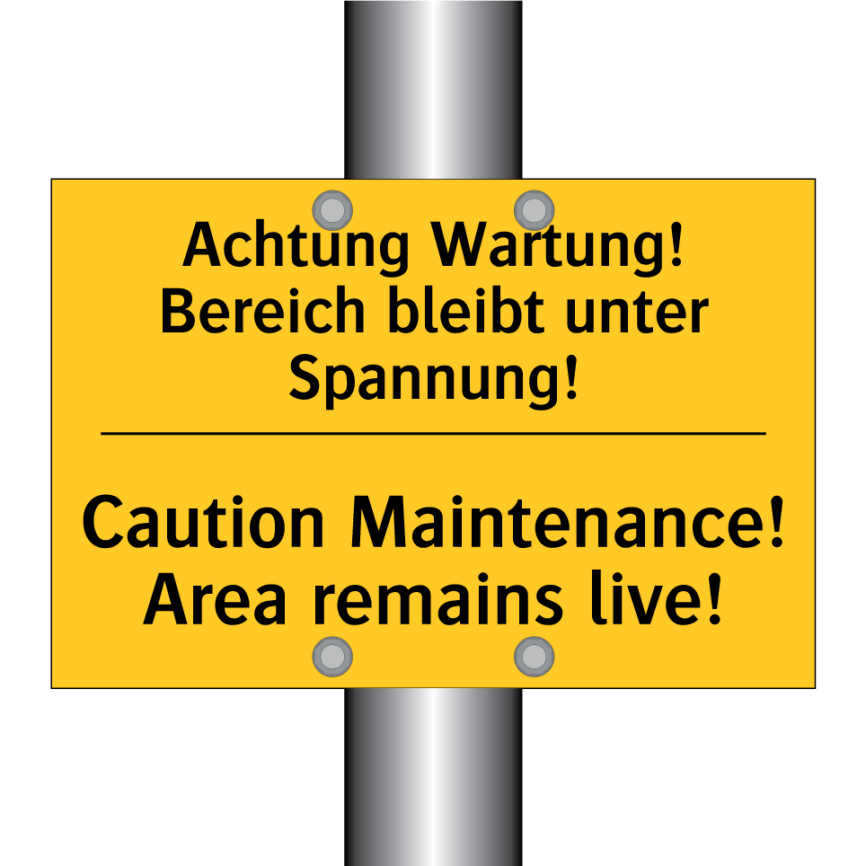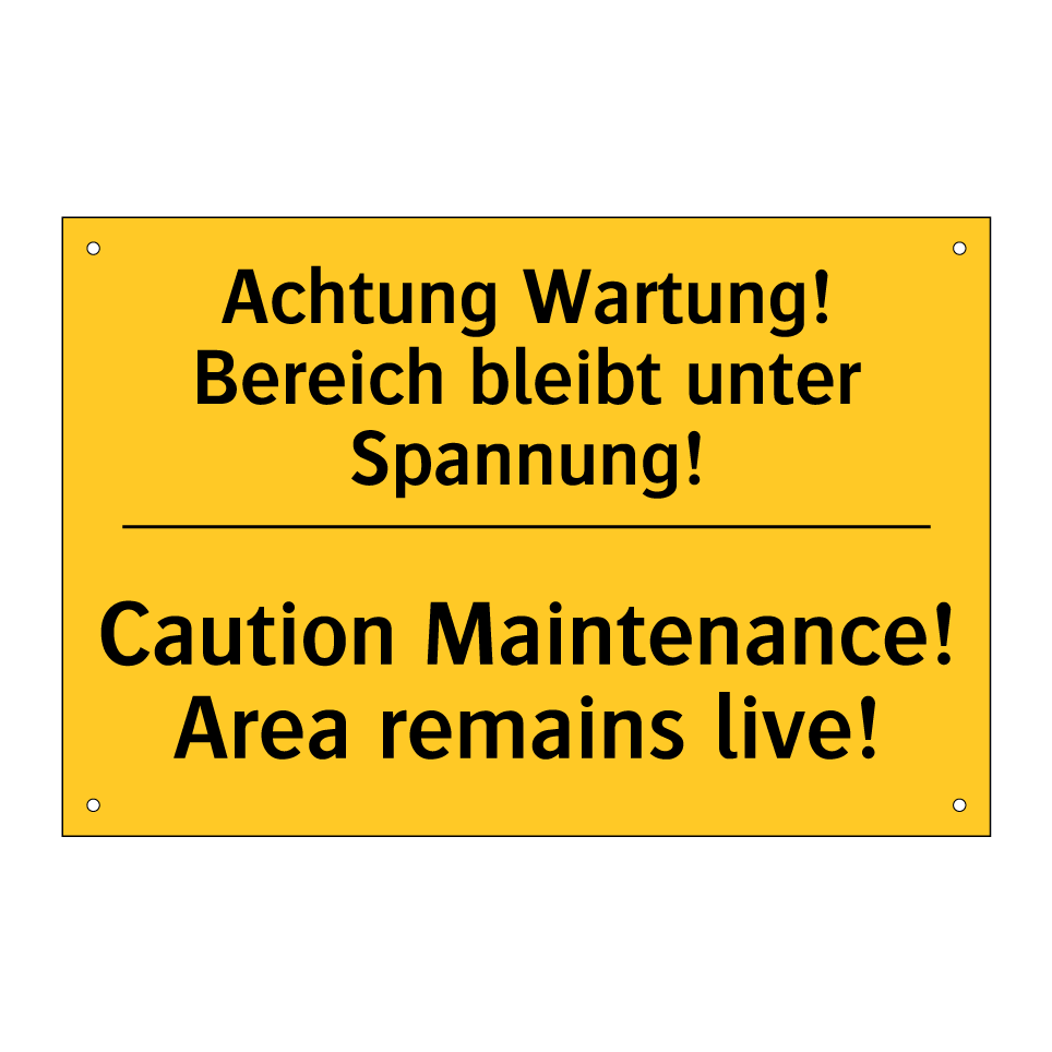 Zweisprachiges Warnschild mit deutschem Text Achtung Wartung! Bereich bleibt unter Spannung! und englischem Text Caution Maintenance! Area remains live!