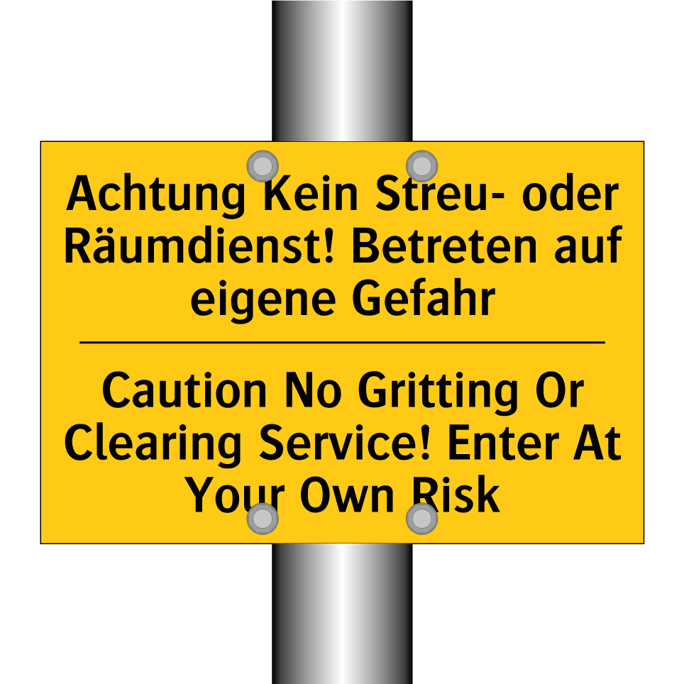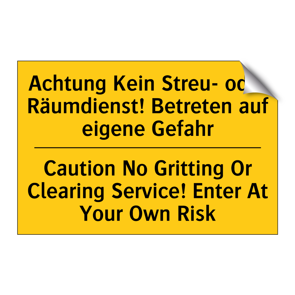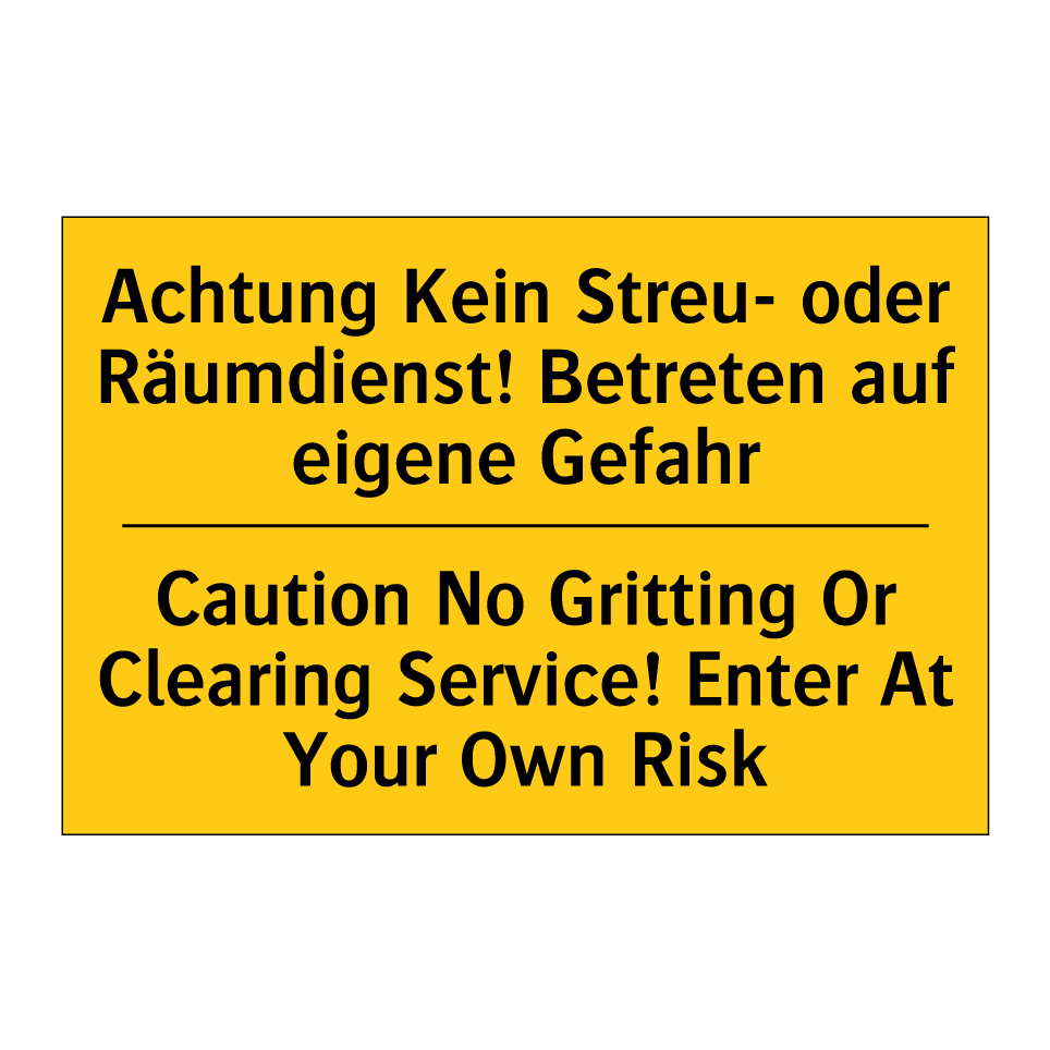 Zweisprachiges Warnschild mit deutschem Text Achtung Kein Streu- oder Räumdienst! Betreten auf eigene Gefahr und englischem Text Caution No Gritting Or Clearing Service! Enter At Your Own Risk