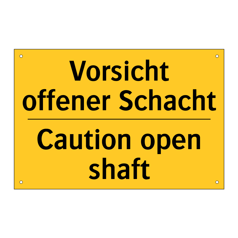 Zweisprachiges Warnschild mit deutschem Text Vorsicht offener Schacht und englischem Text Caution open shaft