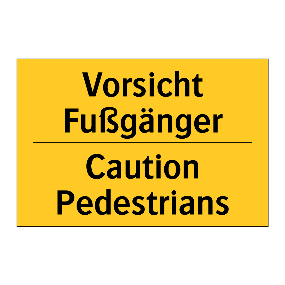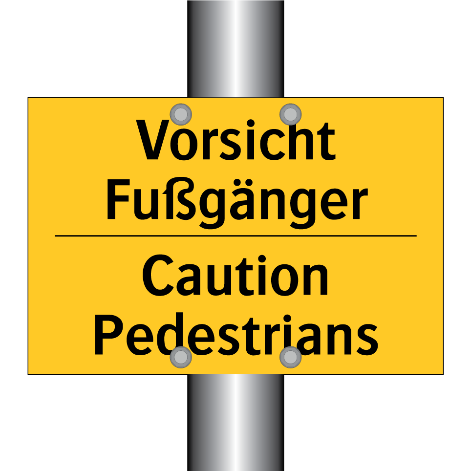Zweisprachiges Warnschild mit deutschem Text Vorsicht Fußgänger und englischem Text Caution Pedestrians