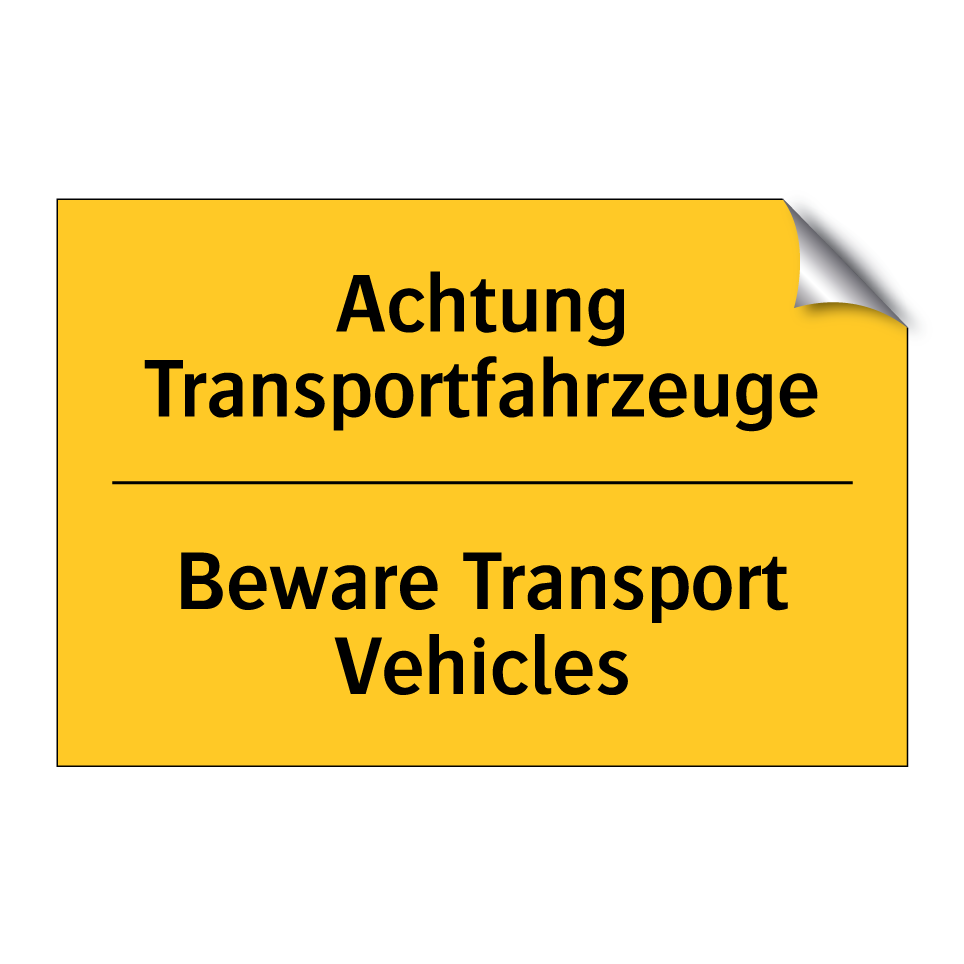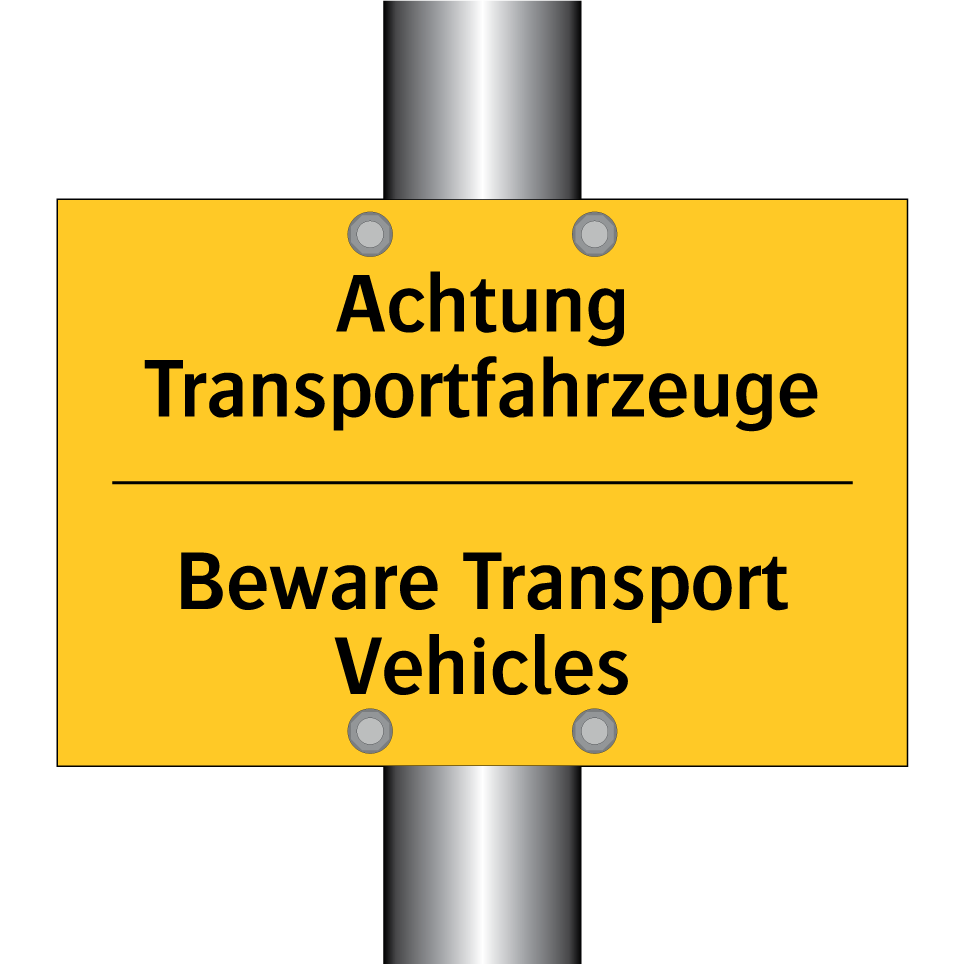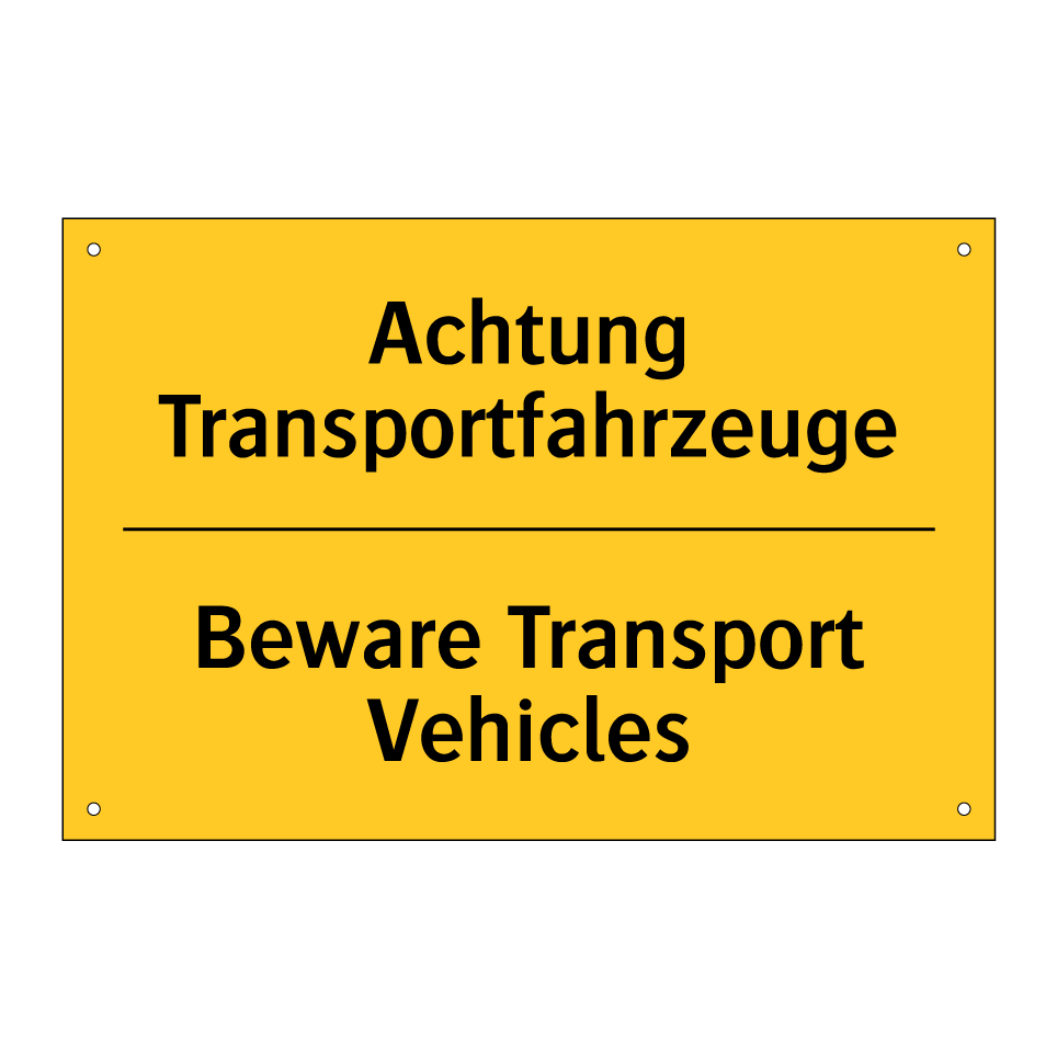 Zweisprachiges Warnschild mit deutschem Text Achtung Transportfahrzeuge und englischem Text Beware Transport Vehicles