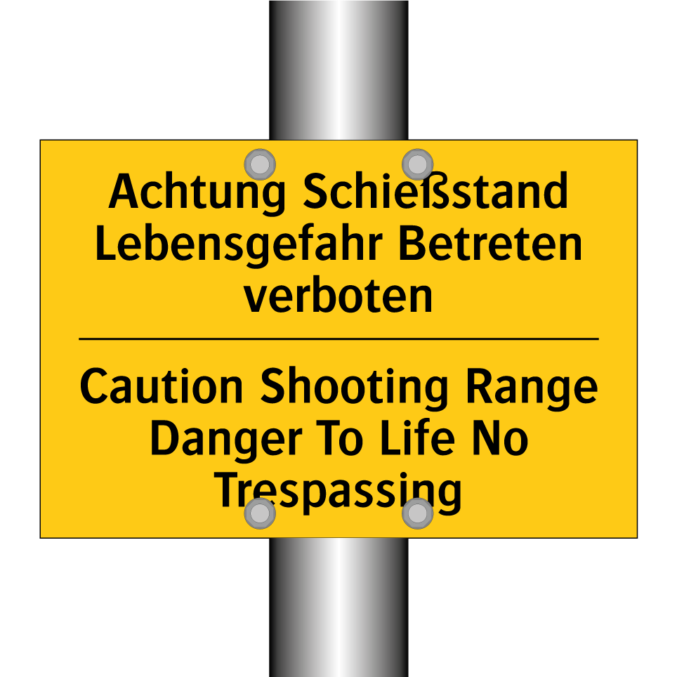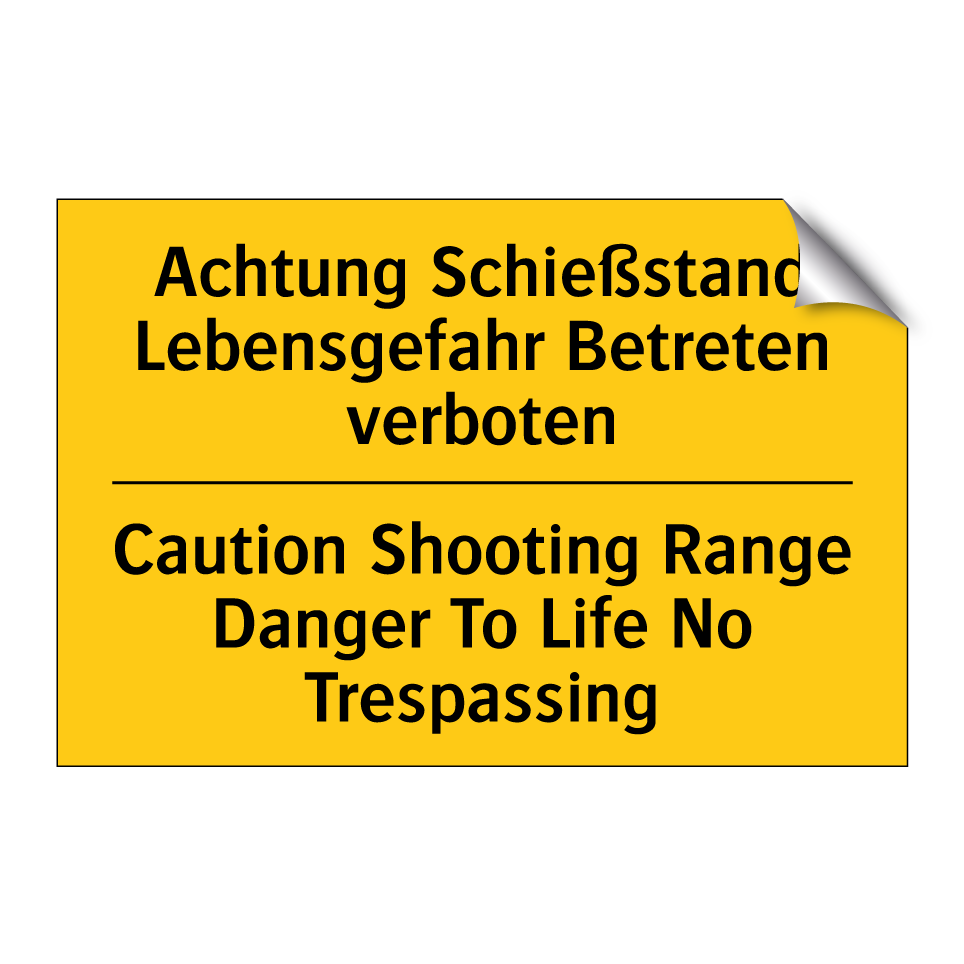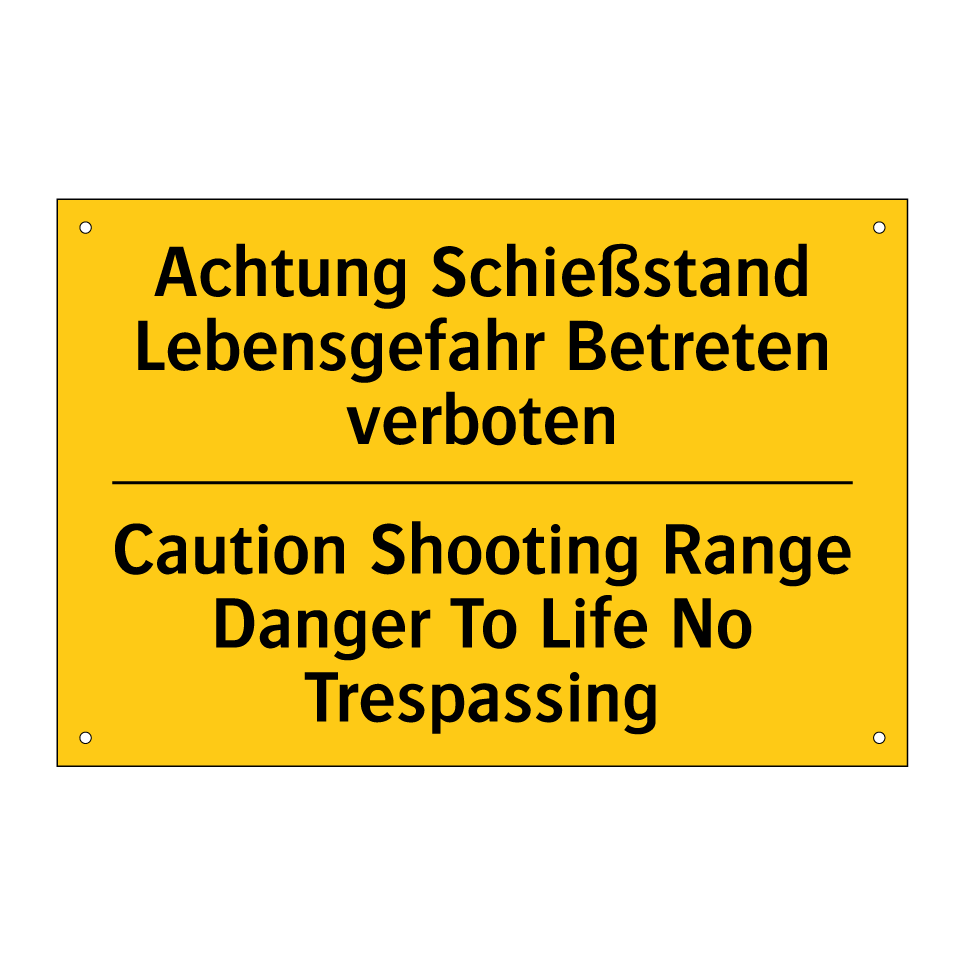 Zweisprachiges Warnschild mit deutschem Text Achtung Schießstand Lebensgefahr Betreten verboten und englischem Text Caution Shooting Range Danger To Life No Trespassing