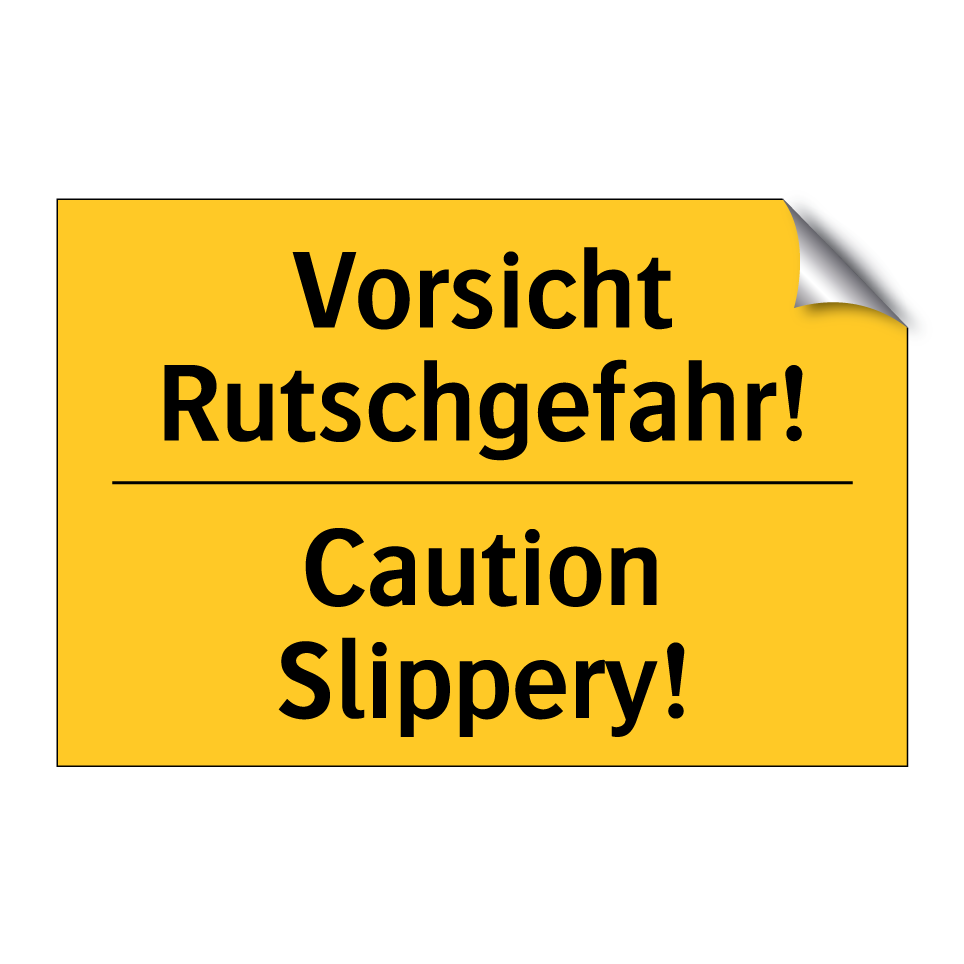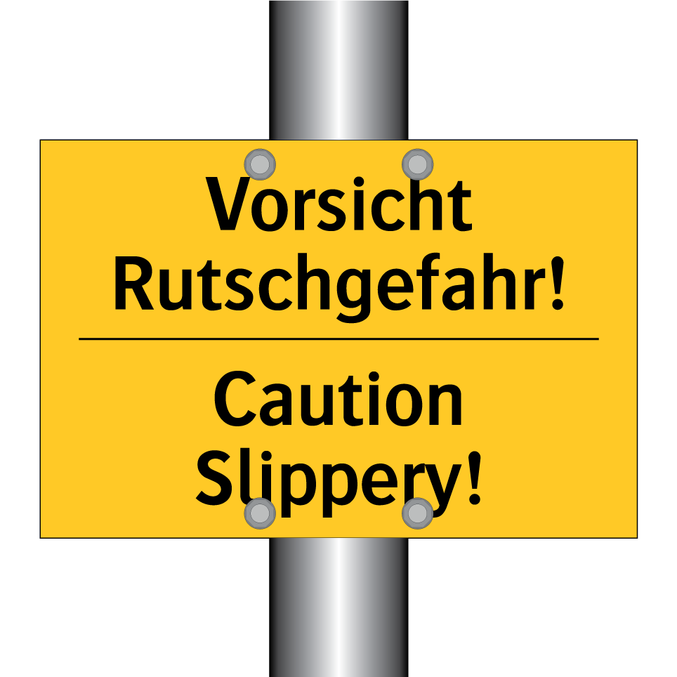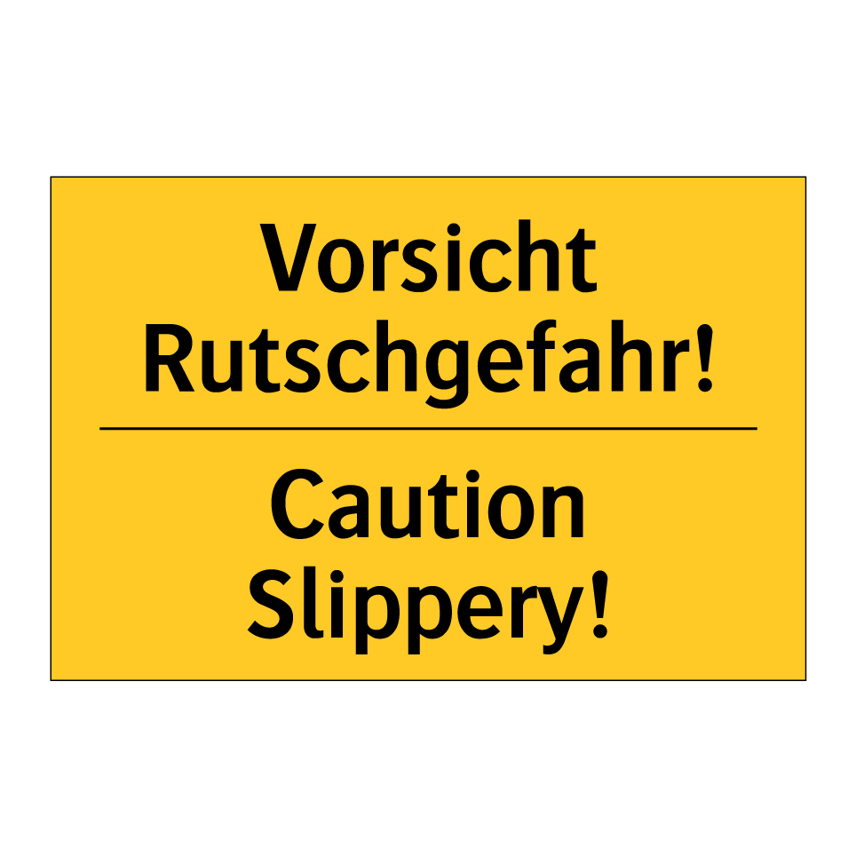 Zweisprachiges Warnschild mit deutschem Text Vorsicht Rutschgefahr! und englischem Text Caution Slippery!