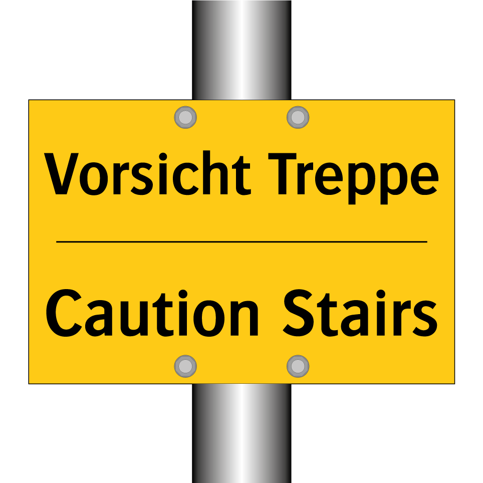 Zweisprachiges Warnschild mit deutschem Text Vorsicht Treppe und englischem Text Caution Stairs