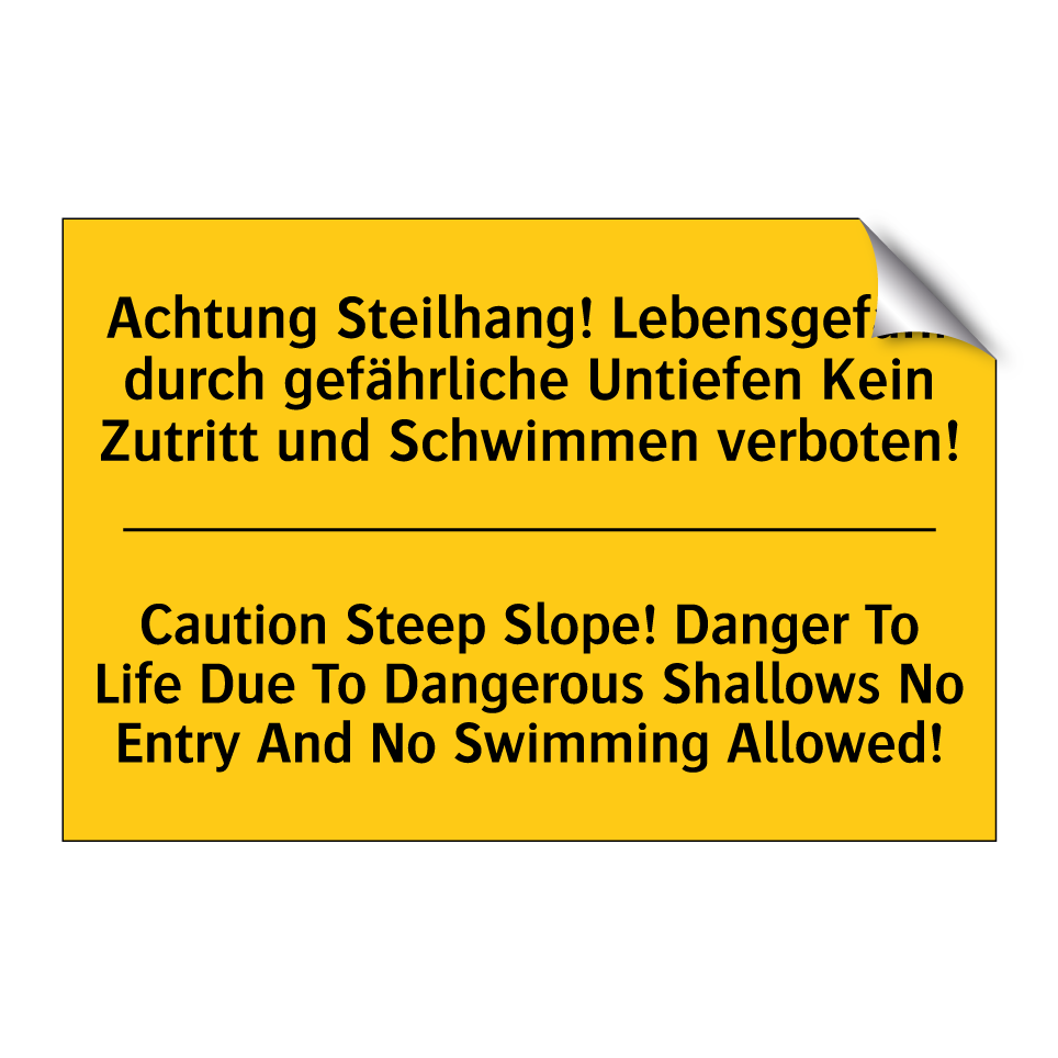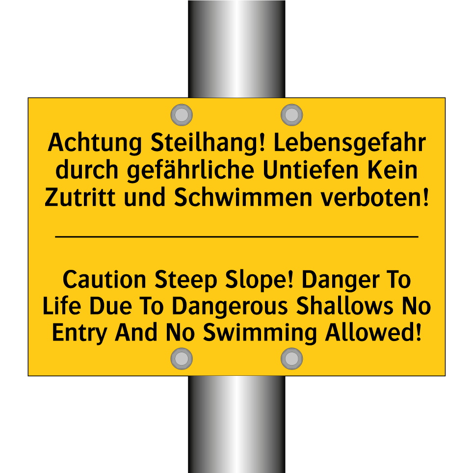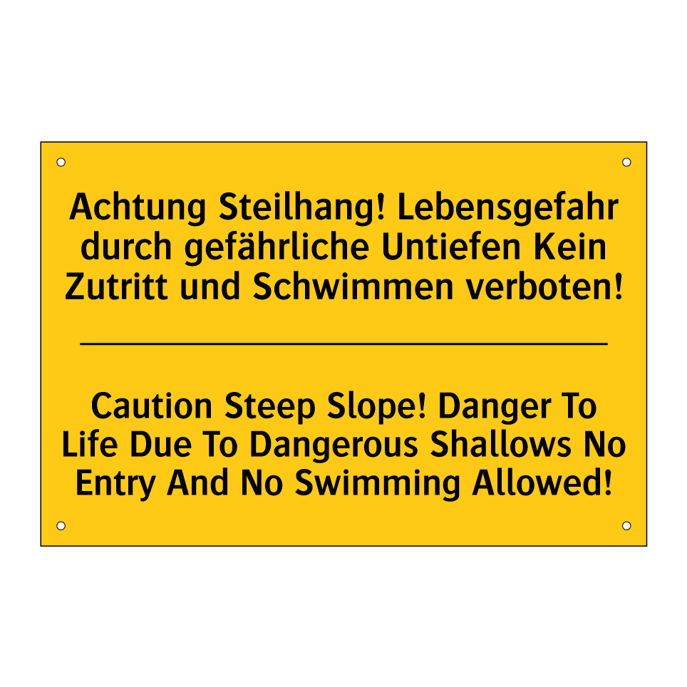 Zweisprachiges Warnschild mit deutschem Text Achtung Steilhang! Lebensgefahr durch gefährliche Untiefen Kein Zutritt und Schwimmen verboten! und englischem Text Caution Steep Slope! Danger To Life Due To Dangerous Shallows No Entry And No Swimming Allowed!