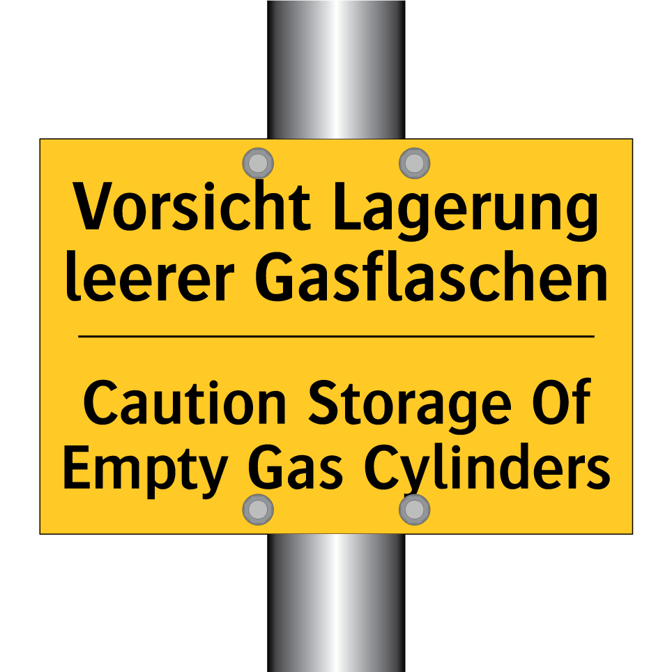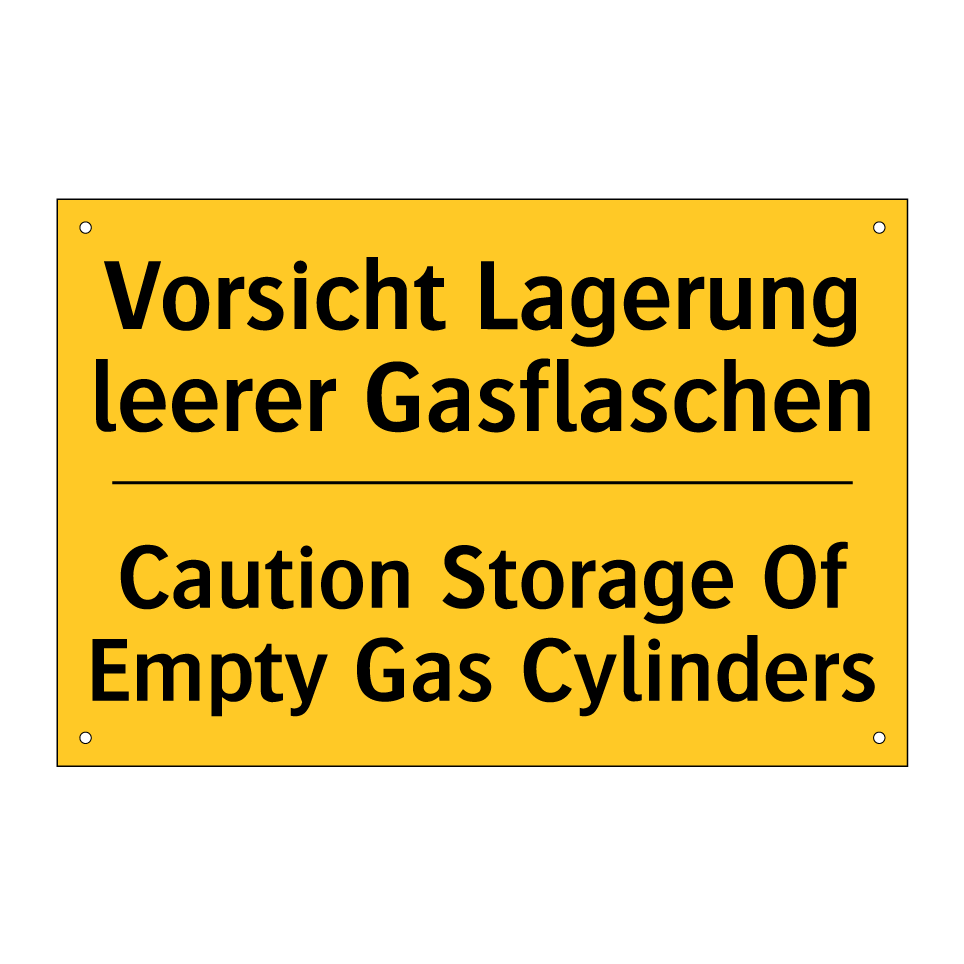 Zweisprachiges Warnschild mit deutschem Text Vorsicht Lagerung leerer Gasflaschen und englischem Text Caution Storage Of Empty Gas Cylinders