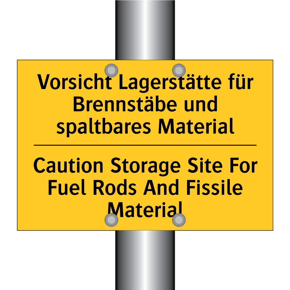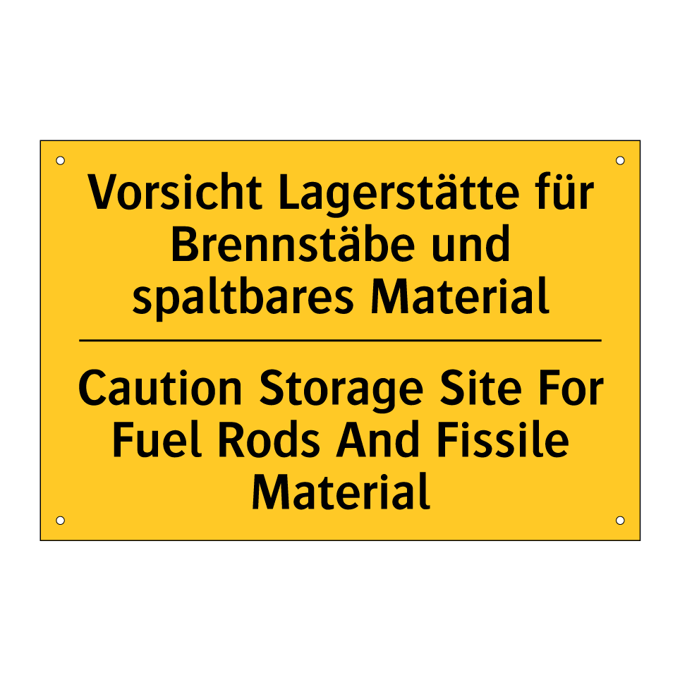 Zweisprachiges Warnschild mit deutschem Text Vorsicht Lagerstätte für Brennstäbe und spaltbares Material und englischem Text Caution Storage Site For Fuel Rods And Fissile Material