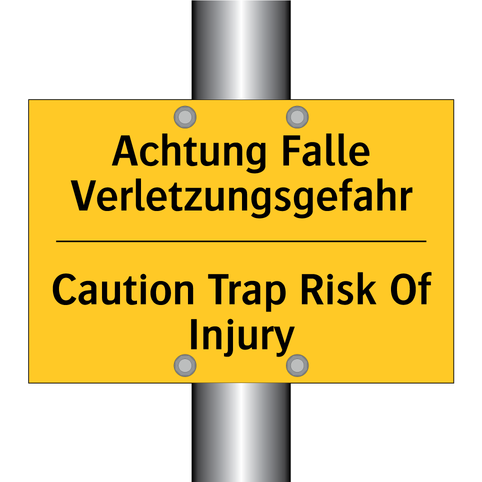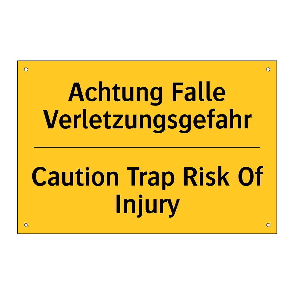 Zweisprachiges Warnschild mit deutschem Text Achtung Falle Verletzungsgefahr und englischem Text Caution Trap Risk Of Injury
