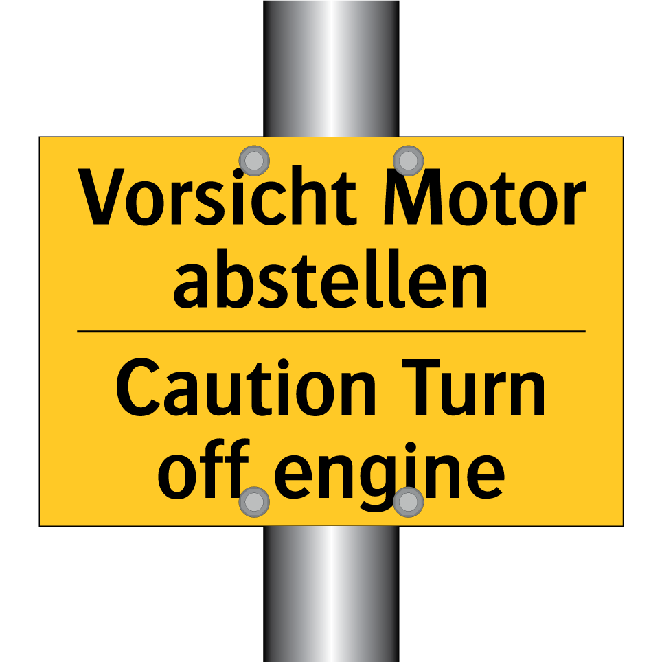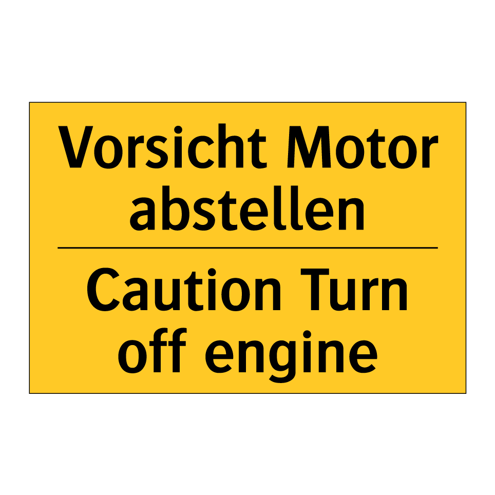 Zweisprachiges Warnschild mit deutschem Text Vorsicht Motor abstellen und englischem Text Caution Turn off engine