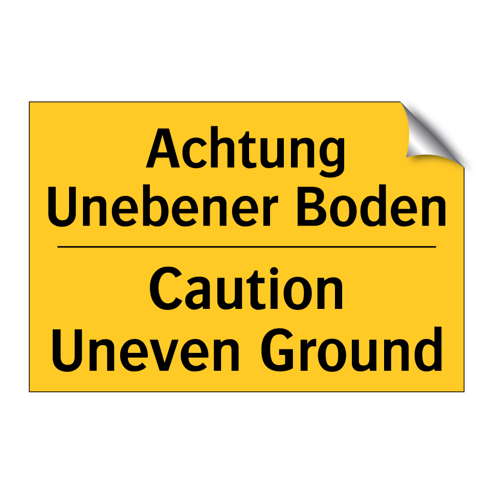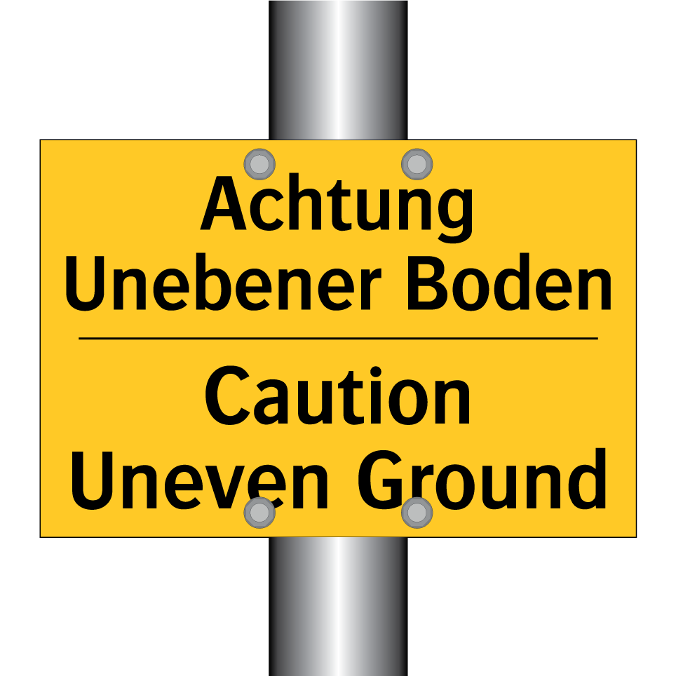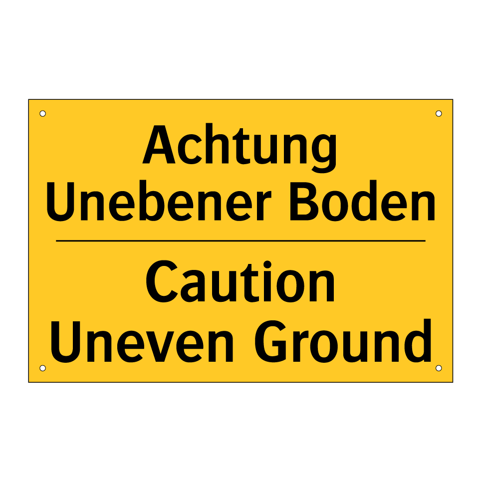 Zweisprachiges Warnschild mit deutschem Text Achtung Unebener Boden und englischem Text Caution Uneven Ground