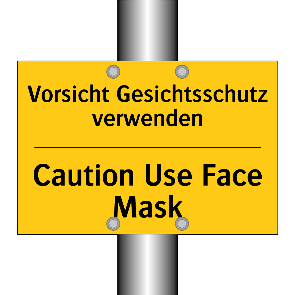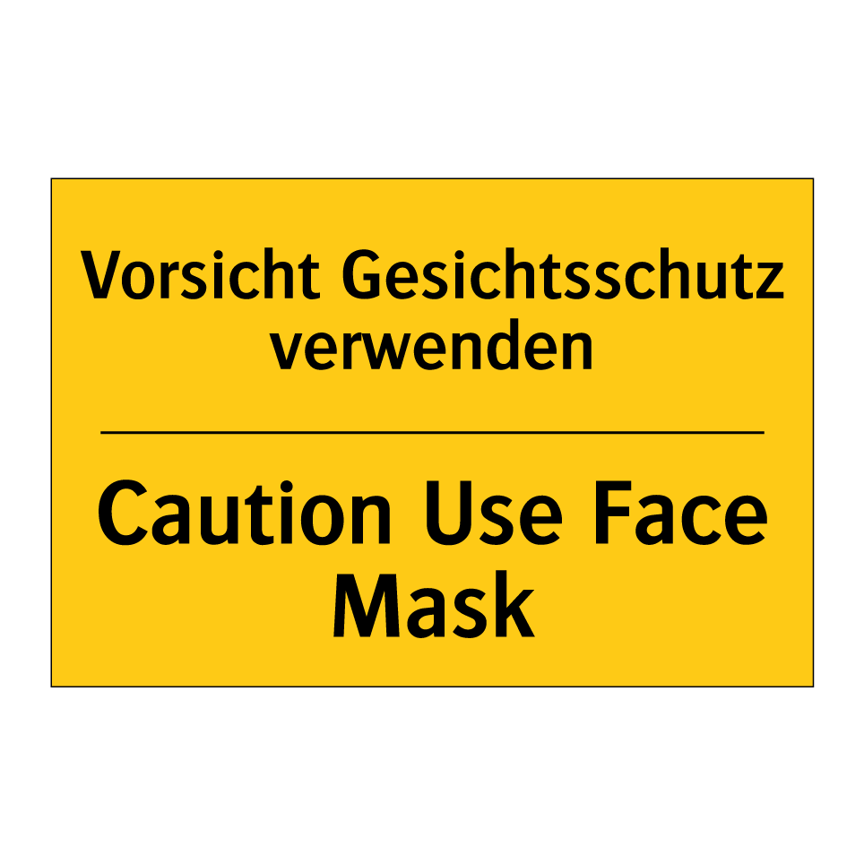Zweisprachiges Warnschild mit deutschem Text Vorsicht Gesichtsschutz verwenden und englischem Text Caution Use Face Mask