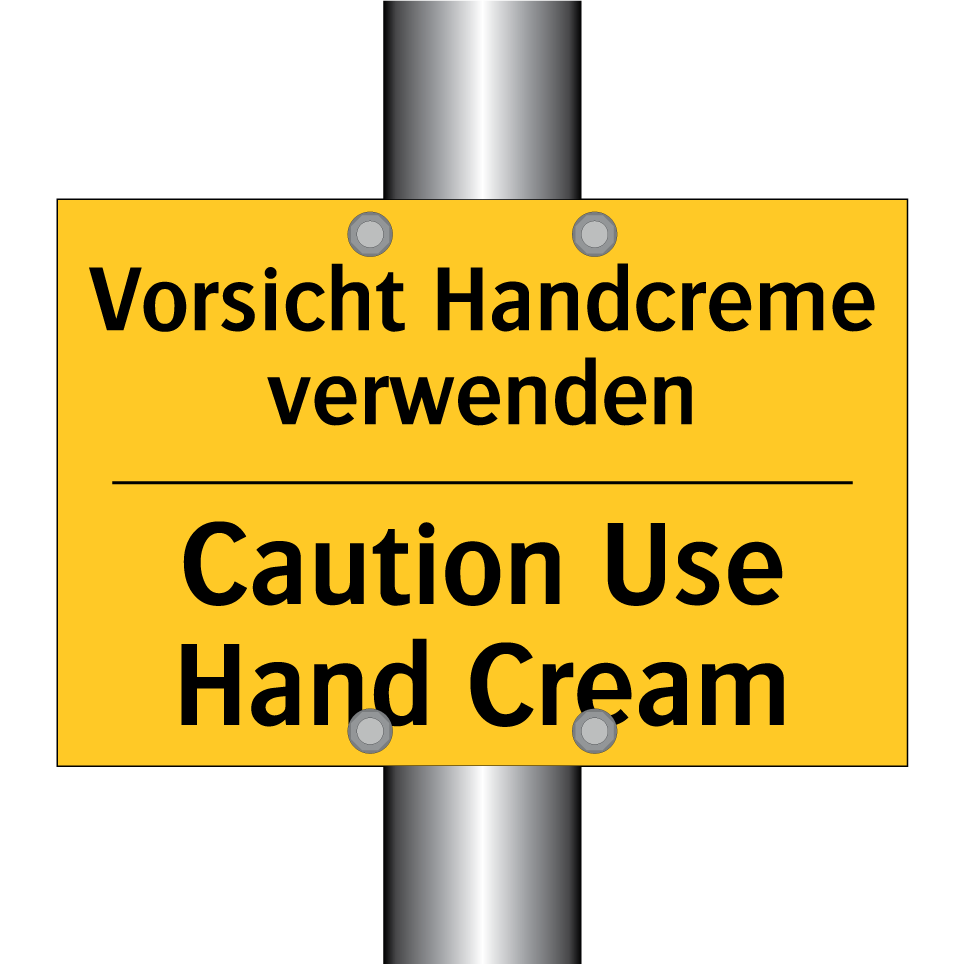 Zweisprachiges Warnschild mit deutschem Text Vorsicht Handcreme verwenden und englischem Text Caution Use Hand Cream