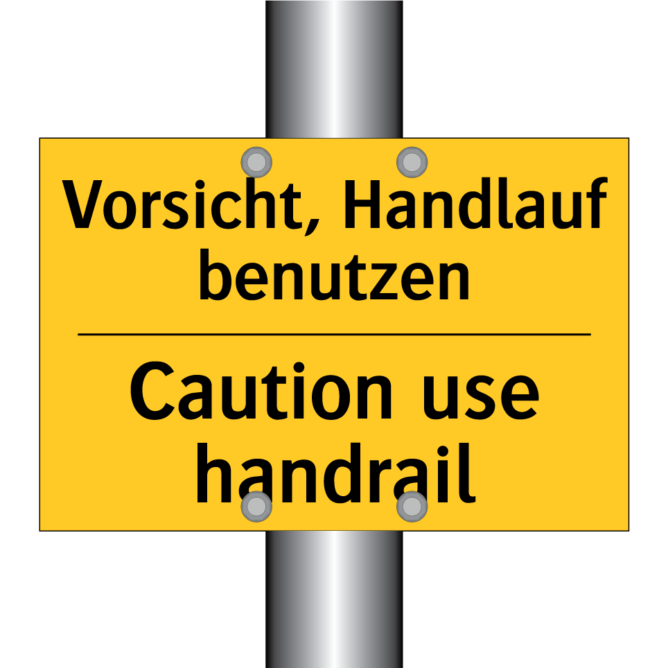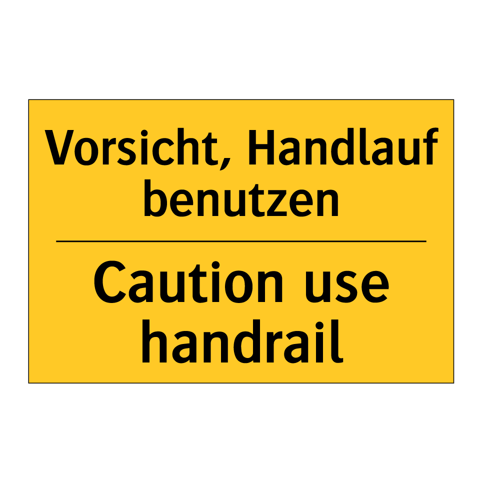 Zweisprachiges Warnschild mit deutschem Text Vorsicht, Handlauf benutzen und englischem Text Caution use handrail