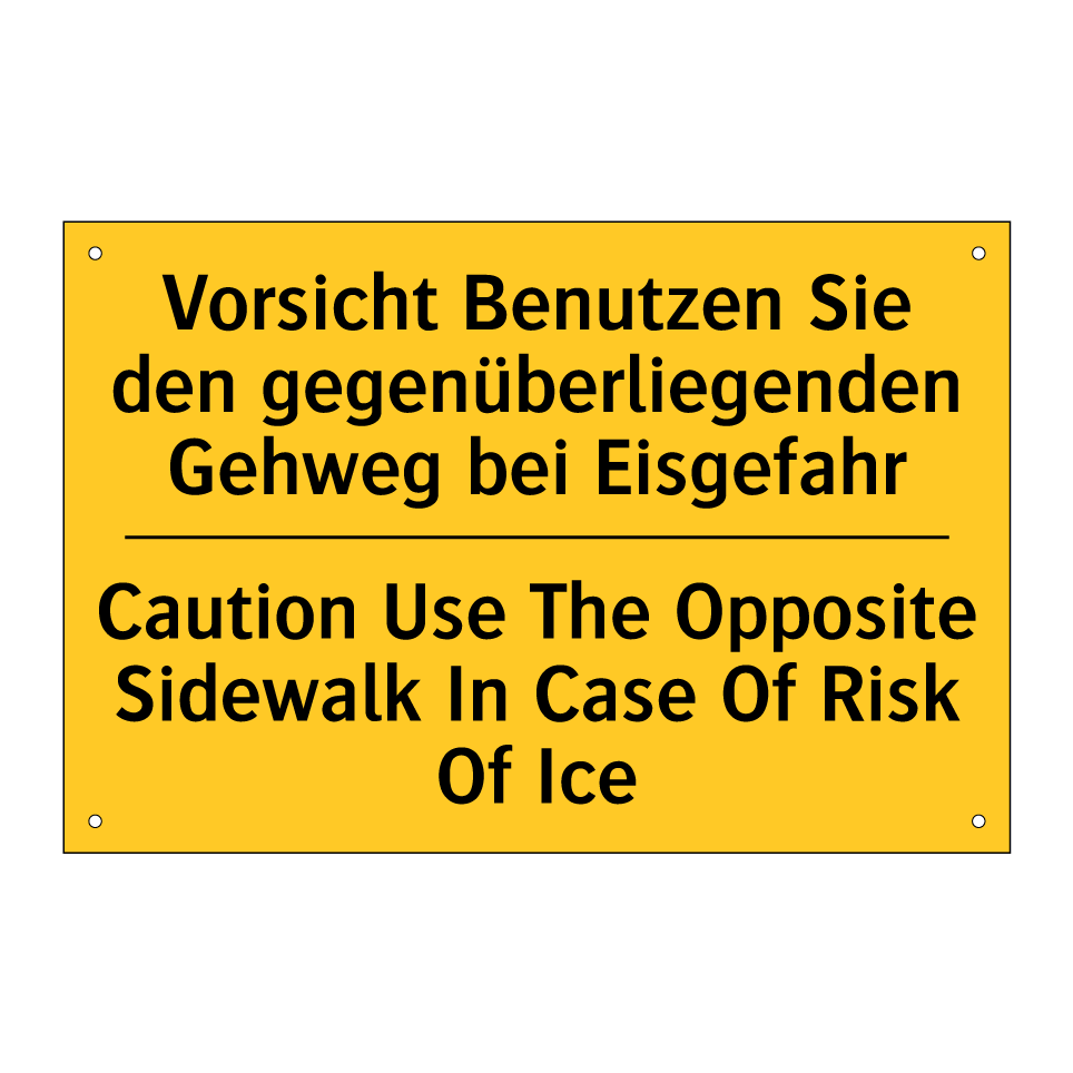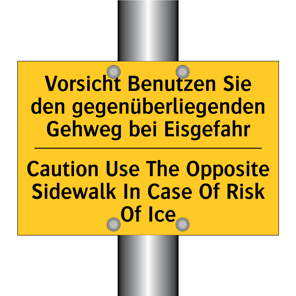 Zweisprachiges Warnschild mit deutschem Text Vorsicht Benutzen Sie den gegenüberliegenden Gehweg bei Eisgefahr und englischem Text Caution Use The Opposite Sidewalk In Case Of Risk Of Ice