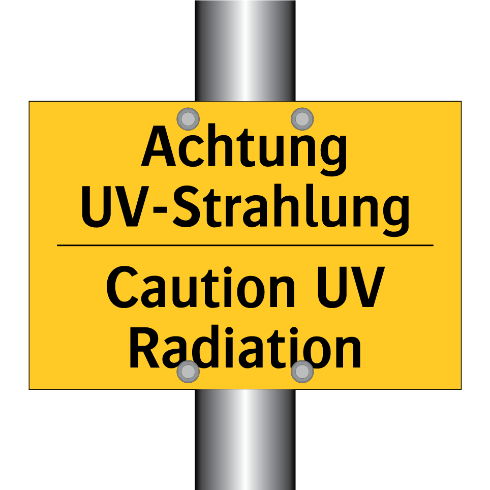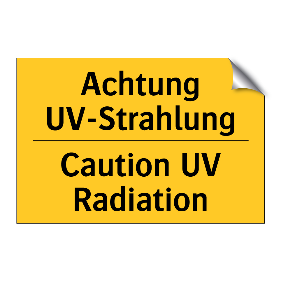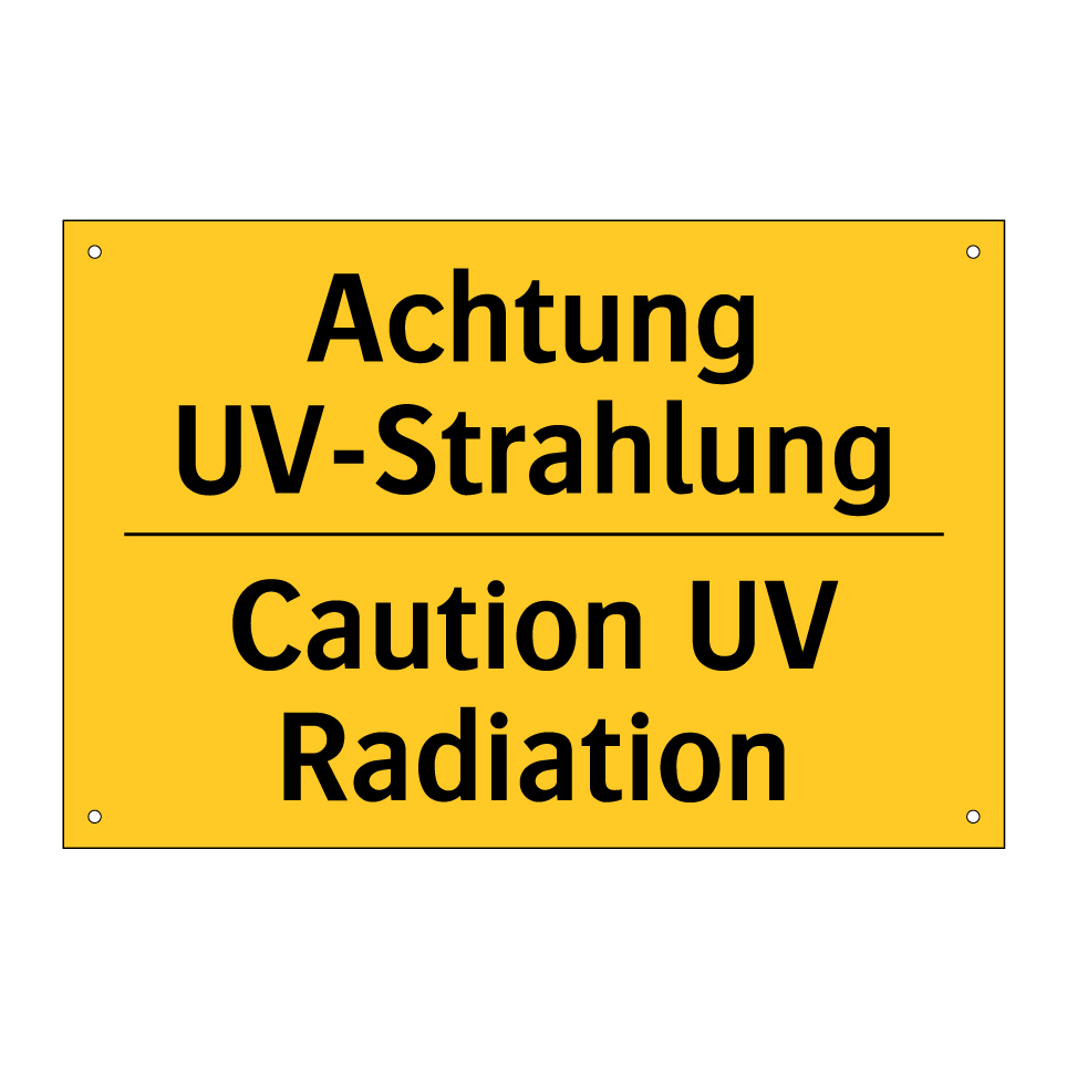 Zweisprachiges Warnschild mit deutschem Text Achtung UV-Strahlung und englischem Text Caution UV Radiation