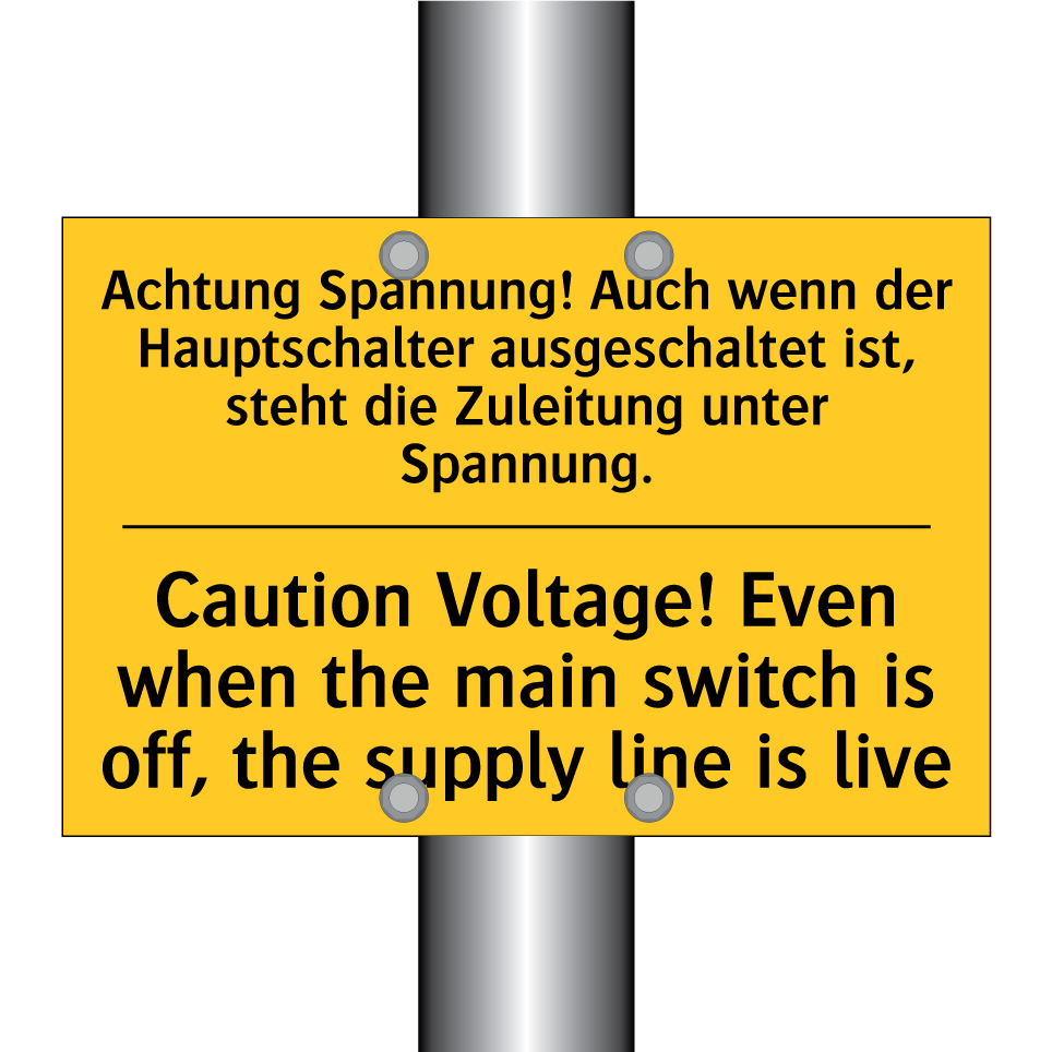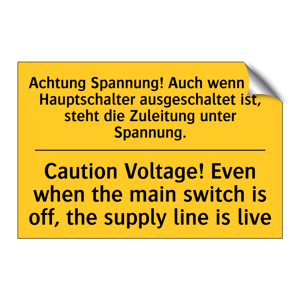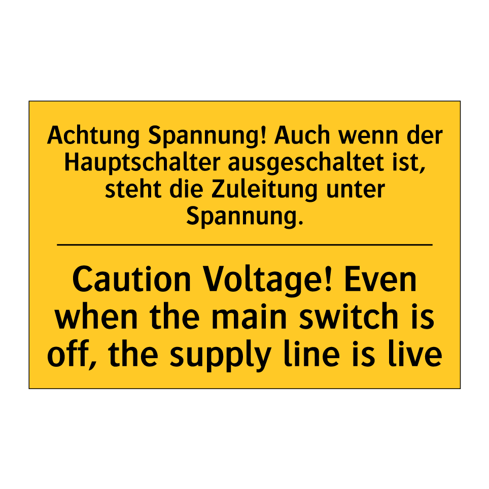 Zweisprachiges Warnschild mit deutschem Text Achtung Spannung! Auch wenn der Hauptschalter ausgeschaltet ist, steht die Zuleitung unter Spannung. und englischem Text Caution Voltage! Even when the main switch is off, the supply line is live