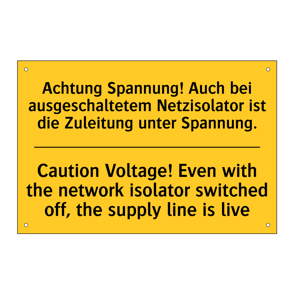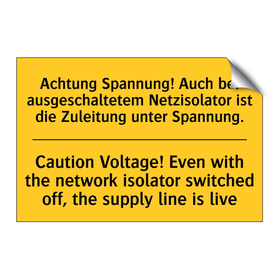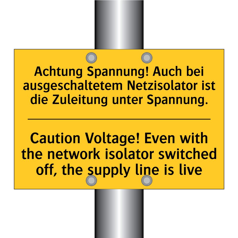 Zweisprachiges Warnschild mit deutschem Text Achtung Spannung! Auch bei ausgeschaltetem Netzisolator ist die Zuleitung unter Spannung. und englischem Text Caution Voltage! Even with the network isolator switched off, the supply line is live