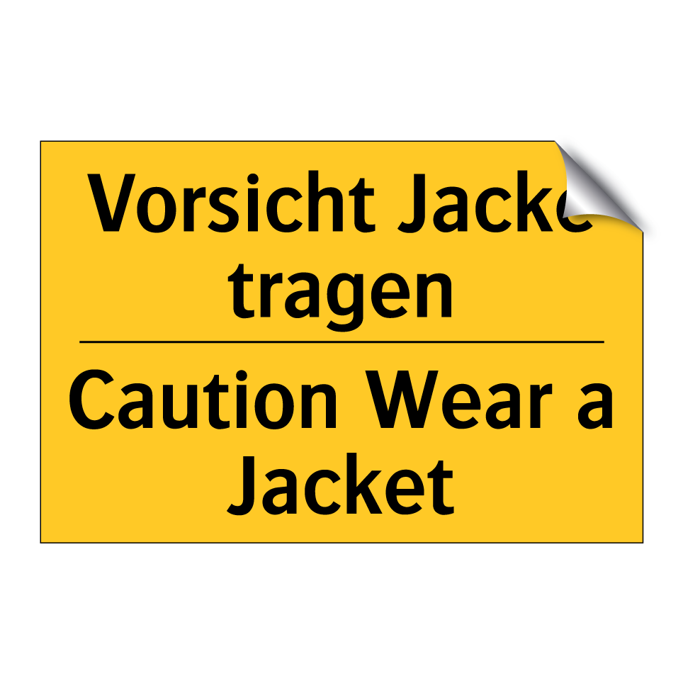 Zweisprachiges Warnschild mit deutschem Text Vorsicht Jacke tragen und englischem Text Caution Wear a Jacket